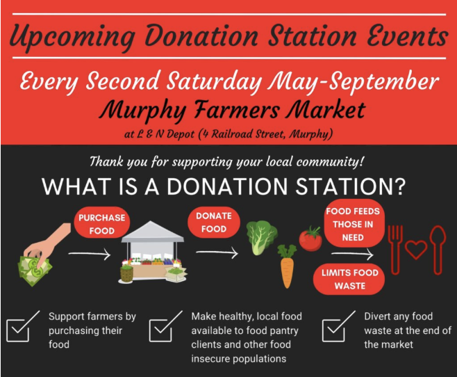 The Extension Donation Station will be held each Second Saturday at the Murphy Farmers Market! The Donation Station helps to supply nutritious food to those in need by donating healthy, local food to food pantries in Cherokee County. This supports our local growers as well as diverts food waste at the end of the market day.