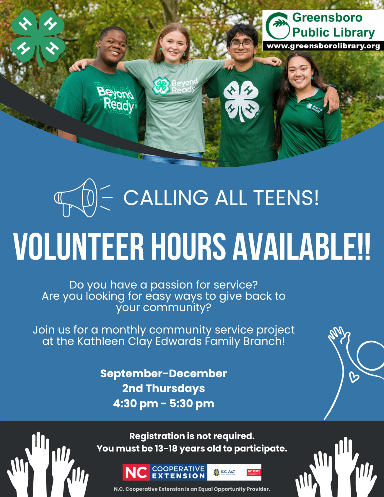 Join us for a monthly community service project at the Kathleen Clay Edwards Family Branch. We will meet the 2nd Thursday of every month September through December from 4:30pm until 5:30pm. Registration not required. For more information or questions, contact Meredith.