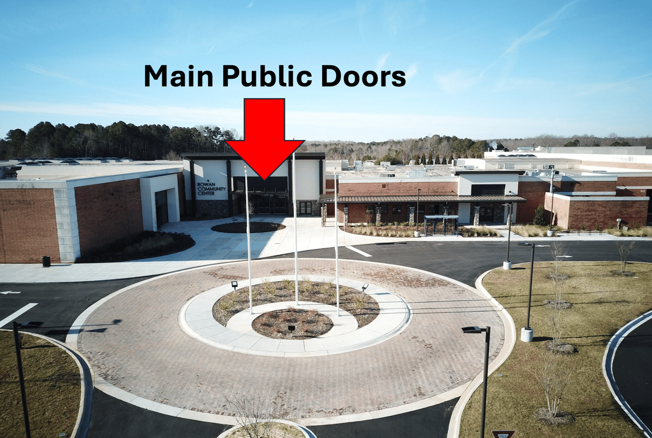Below is a picture showing our main building entrance to access our office. Once inside the interior of the Rowan Community Center (they are calling the interior the "concourse"), then you'll go straight, then take a right, and our ag. suite is on the left. Once inside the ag. suite lobby, we are the first door on the right.