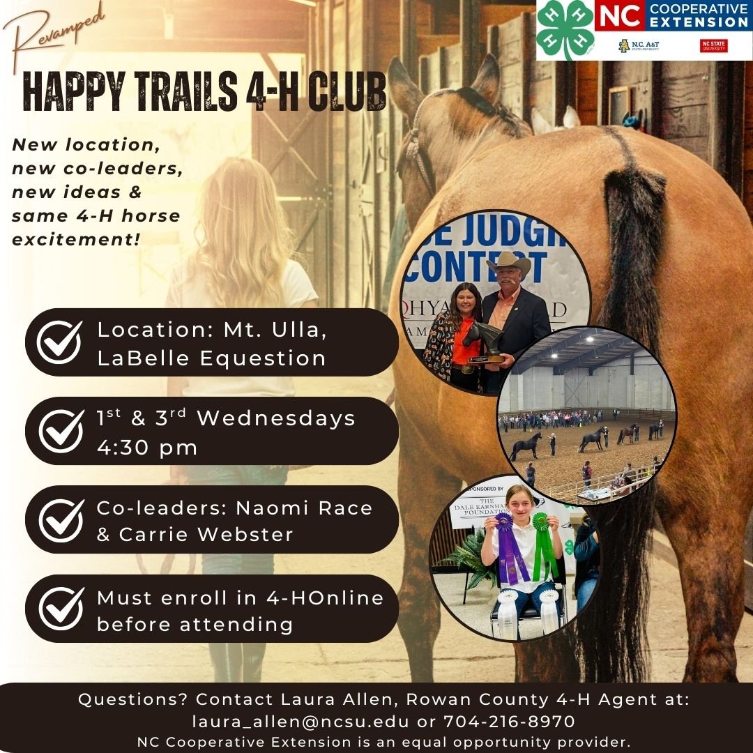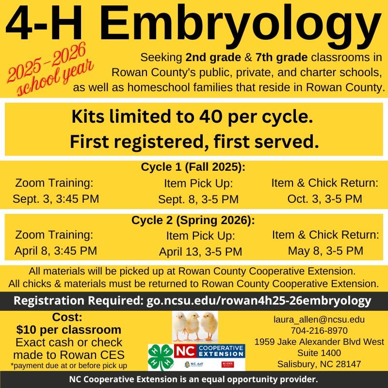LIVESTOCK: Rowan County 4-H will begin practicing in early 2026 for next years' contests, which are held in in late July/early August. This opportunity is led by 4-H volunteer Eric Deal. Contact Mrs. Laura if interested.