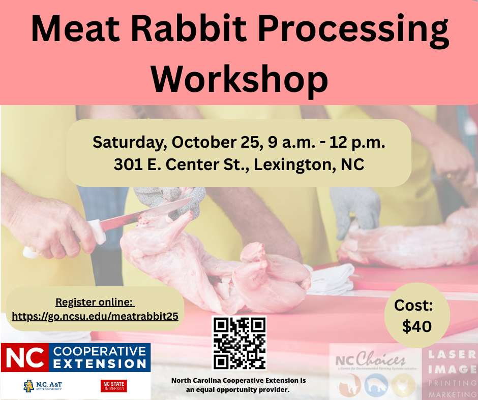 There will be a Rabbit Processing Workshop on Saturday, October 25 from 9 a.m. until 12 p.m. It will be held at the Davidson County Extension Office, 301 E. Center St., Lexington, NC.