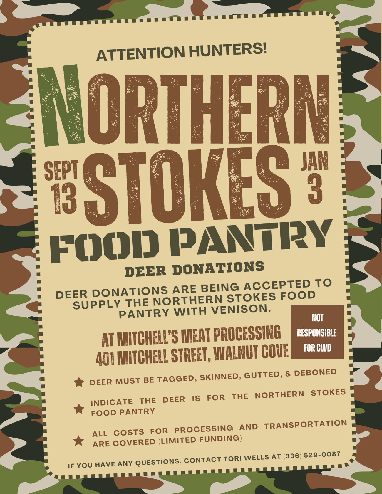 There "may" be opportunities to donate your deer to a local food pantry. The deer would need to be skinned, gutted, de-boned and placed in a cooler on ice with a tag number and delivered to Mitchell's Meat Processing in Walnut Cove for cutting now through January 3. Mitchell's can also accept deer after that date WITH a valid depredation permit number. Indicate that the deer is for the food pantry and Mitchell's will handle the rest at no cost to you! This is dependent on funding and CWD regulations. Contact Mitchell's at 336-591-7420 or text 336-310-9538 with questions about deer processing.