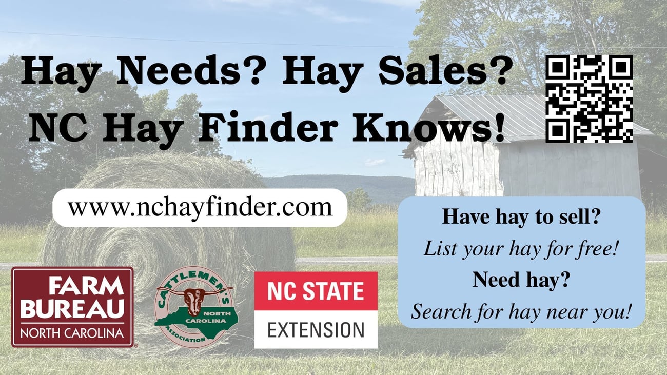 Do You Sell Hay? Add It to our Hay Directory - Hay dealers are encouraged to create an account on our brand new NC Hay Finder Directory. Visit https://www.nchayfinder.com/, and click Create a Listing, create your account, and then list your product. Photos (that match the listing) are encouraged. Avoid label claims like "herbicide free", "organic", etc.