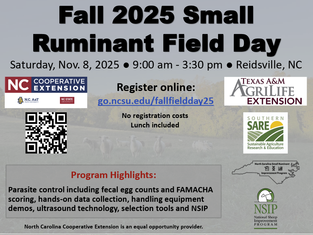 Join us Saturday, November 8 from 9 a.m. to 4:30 p.m. at the Upper Piedmont Research Station in Reidsville to learn about sheep genetics and data collection, estimated breeding values, real world scenarios of ram evaluation and parasite management. Sheep handling systems will also be on display. Our speaker will be Jake Thorne, Small Ruminant Specialist from Texas A&M University and Dr. Andrew Weaver, Small Ruminant Specialist from NC State University.