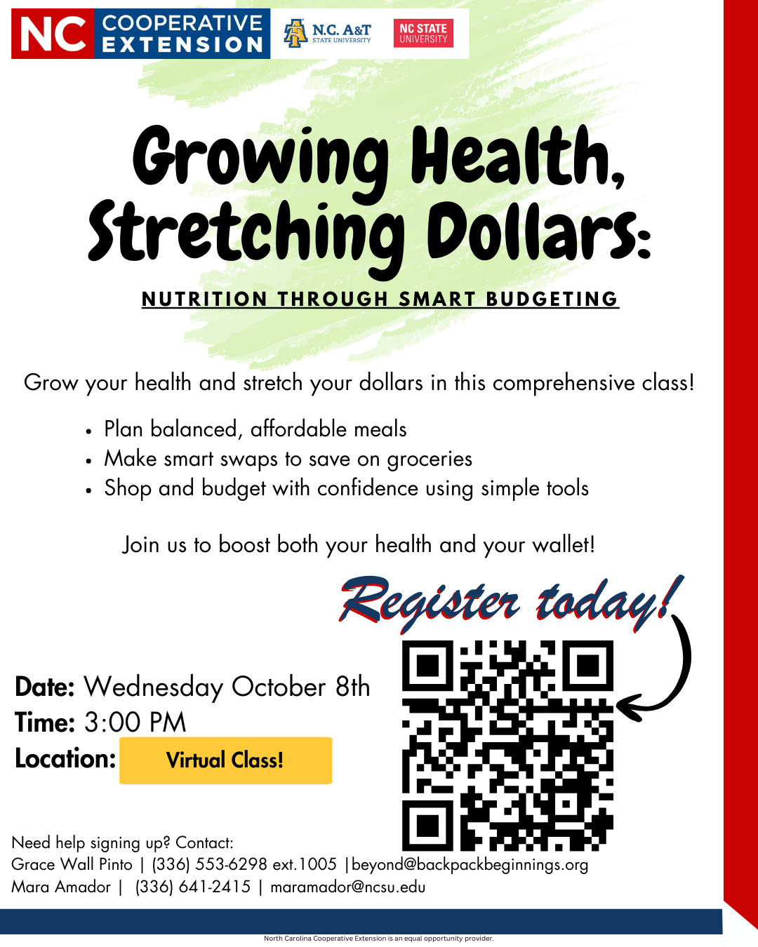 This brochure, developed through a collaborative effort across various programs at NC Cooperative Extension, Guilford County, offers essential tools for enhancing budgeting and food management skills. It features a QR code that links to a digital version filled with valuable resources, including meal planning templates, a 14-day meal plan, spending trackers, healthy eating tips, and a food handling guide. Feel free to print & share! 🤗