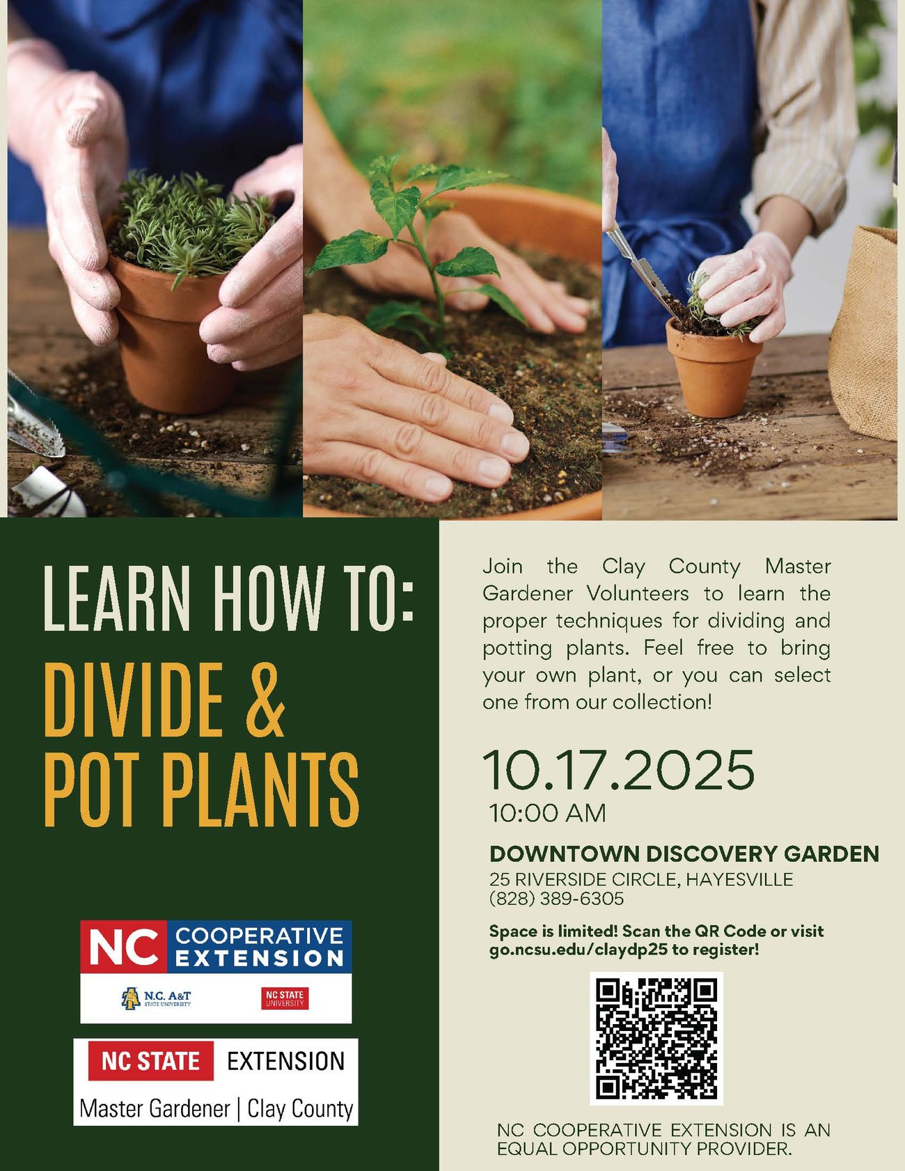 The N.C. Cooperative Extension – Clay County Center and the Clay County Master Gardener Volunteers will host a hands-on class on Dividing and Potting Plants on Thursday, October 17 at 10:00 a.m. at the Downtown Discovery Garden in Hayesville. This educational program will guide participants through the process of dividing perennials and properly potting plants to encourage healthy growth and longer-lasting gardens. Attendees will learn step-by-step techniques, gain tips on plant care, and have the opportunity to practice these skills with guidance from trained volunteers. The class is free and open to the public, providing a great chance for