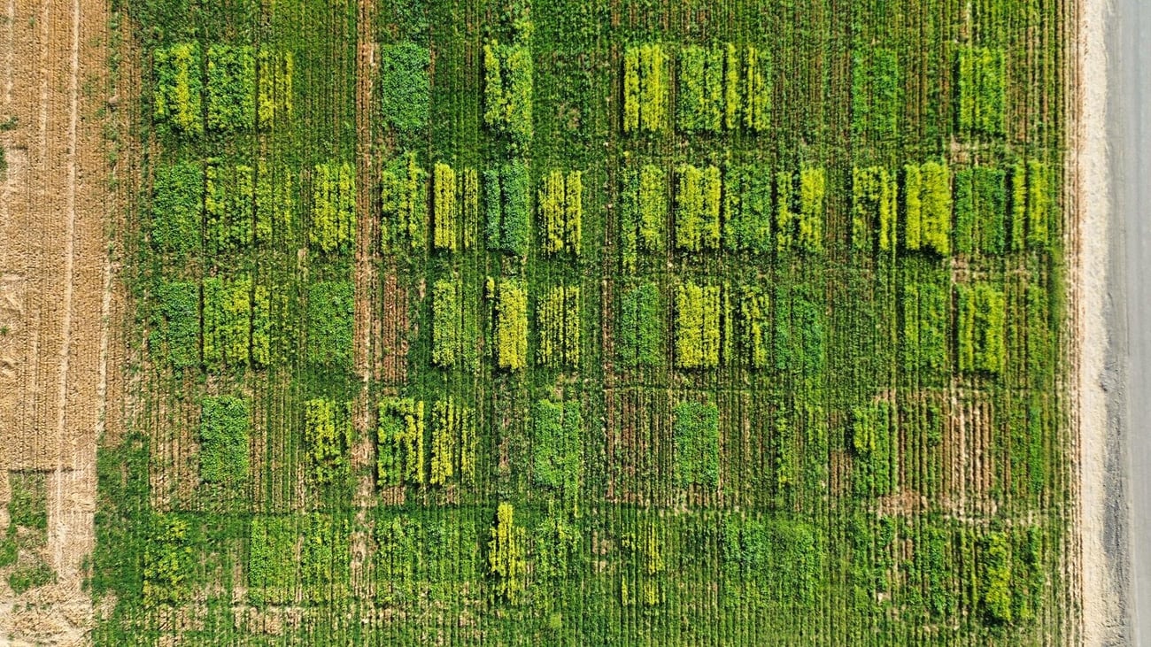 Right photo: An aerial view of biofumigant cover crops at Malheur Experiment Station, Ontario, Oregon, in 2024. Credit: Clarke Alder, Amalgamated Sugar