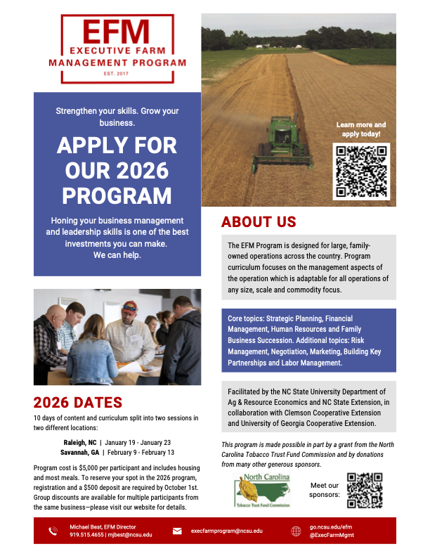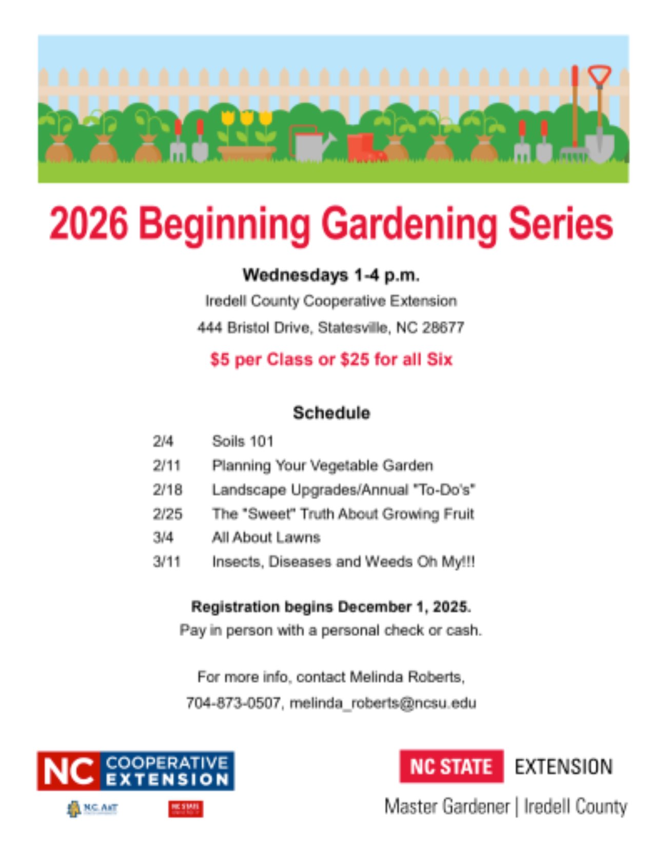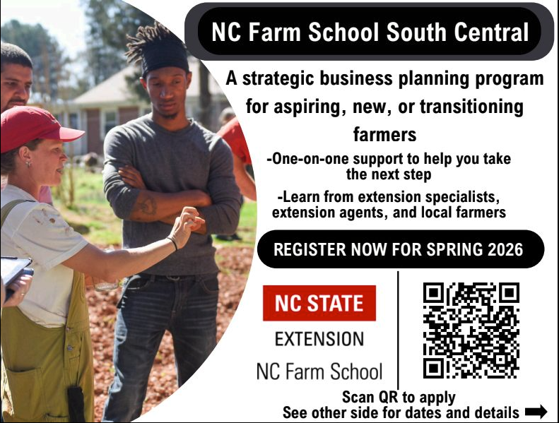 Interested in learning about the business side of farming? If so, join NCSU South Central Ag Agents for the 2026 NC Farm School. For more information, scan the QR code below or call the Iredell County Extension Office @ (704) 873-0507 and ask for Laura Elmore (Livestock and Field Crops Agent) or Melinda Roberts (Horticulture Agent).  |