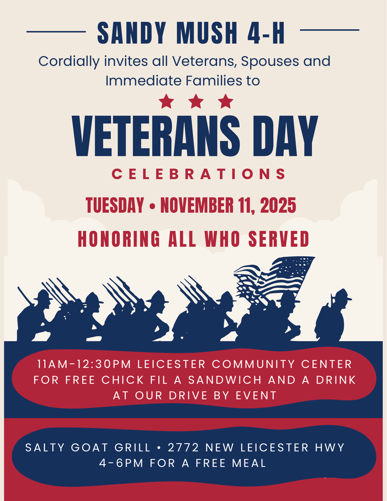 Our Sandy Mush 4-H Club will be hosting two events on Tuesday, November 11th to recognize the Veterans who have served our Country.