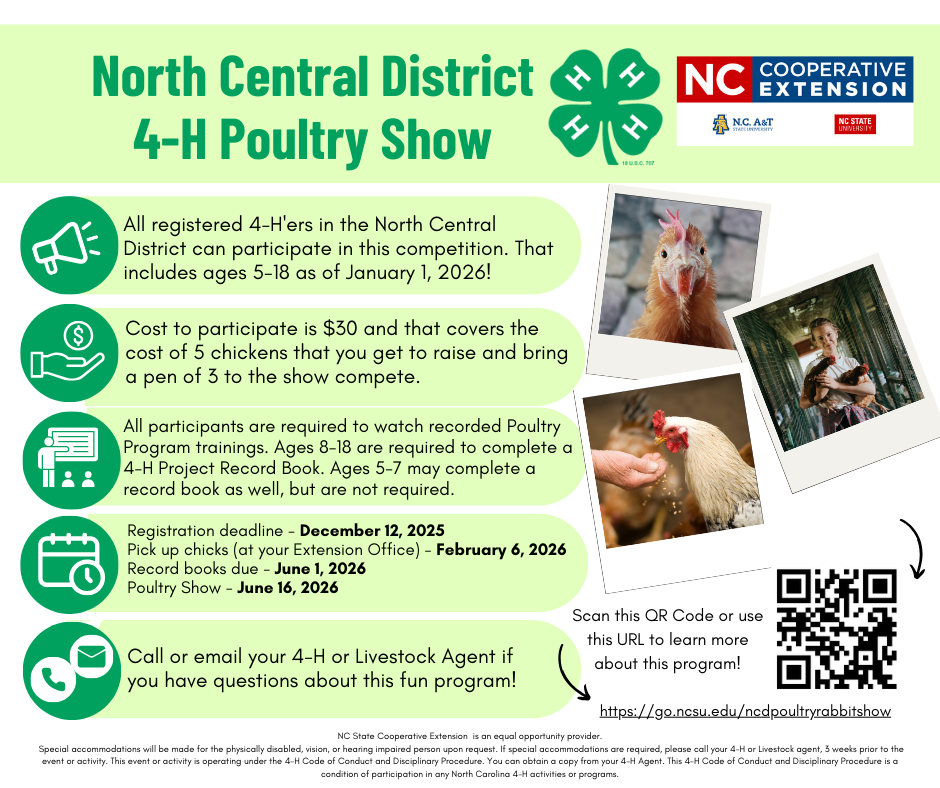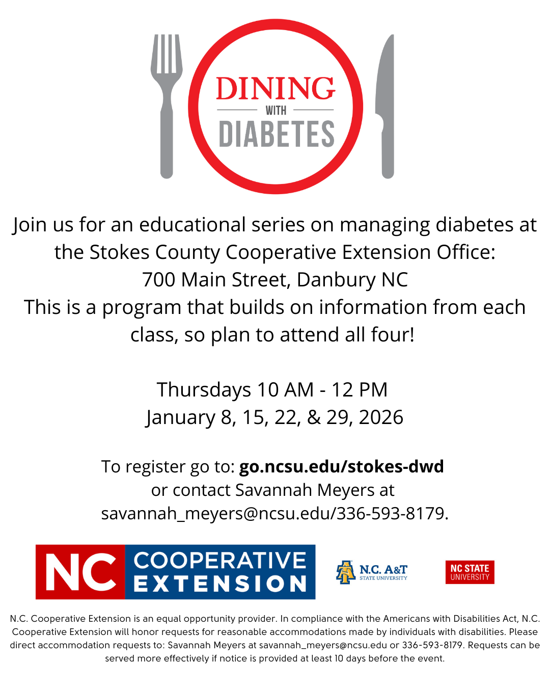In compliance with the Americans with Disabilities Act, Extension will honor requests for reasonable accommodations made by individuals with disabilities. Please direct accommodation requests to: Matt Lenhardt, matt_lenhardt@ncsu.edu, or 336-593-8179. Requests can be served more effectively if notice is provided at least 10 days before the event.