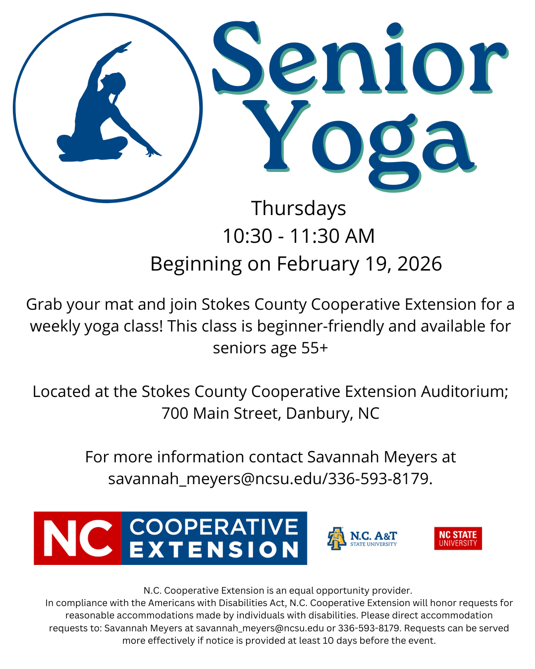 Grab your mat and join Stokes County Cooperative Extension for a weekly yoga class! This class is beginner-friendly and available for seniors age 55+.