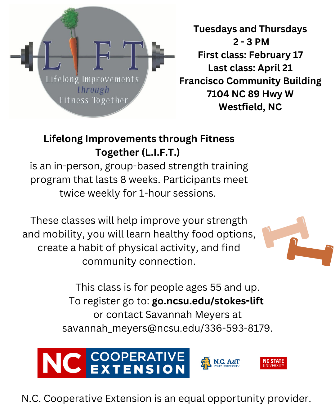 LIFT is an in-person, group-based strength training program that lasts 8 weeks. Participants meet twice weekly for 1-hour sessions. These classes will help improve your strength and mobility, you will learn healthy food options, create a habit of physical activity, and find community connection. |