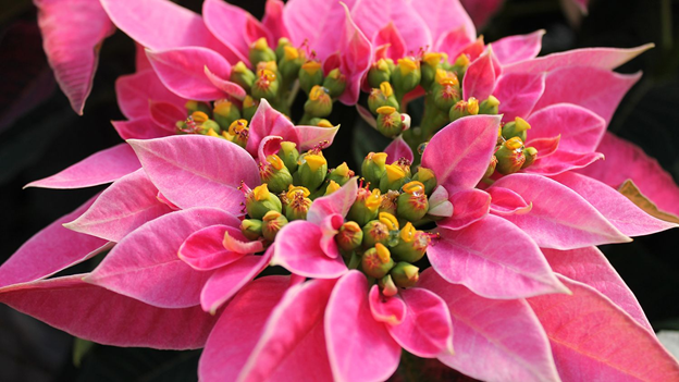 The vibrant “blooms” we associate with poinsettias are actually bracts, or modified leaves. The true flowers are the small, yellow structures nestled at the center of the bracts.