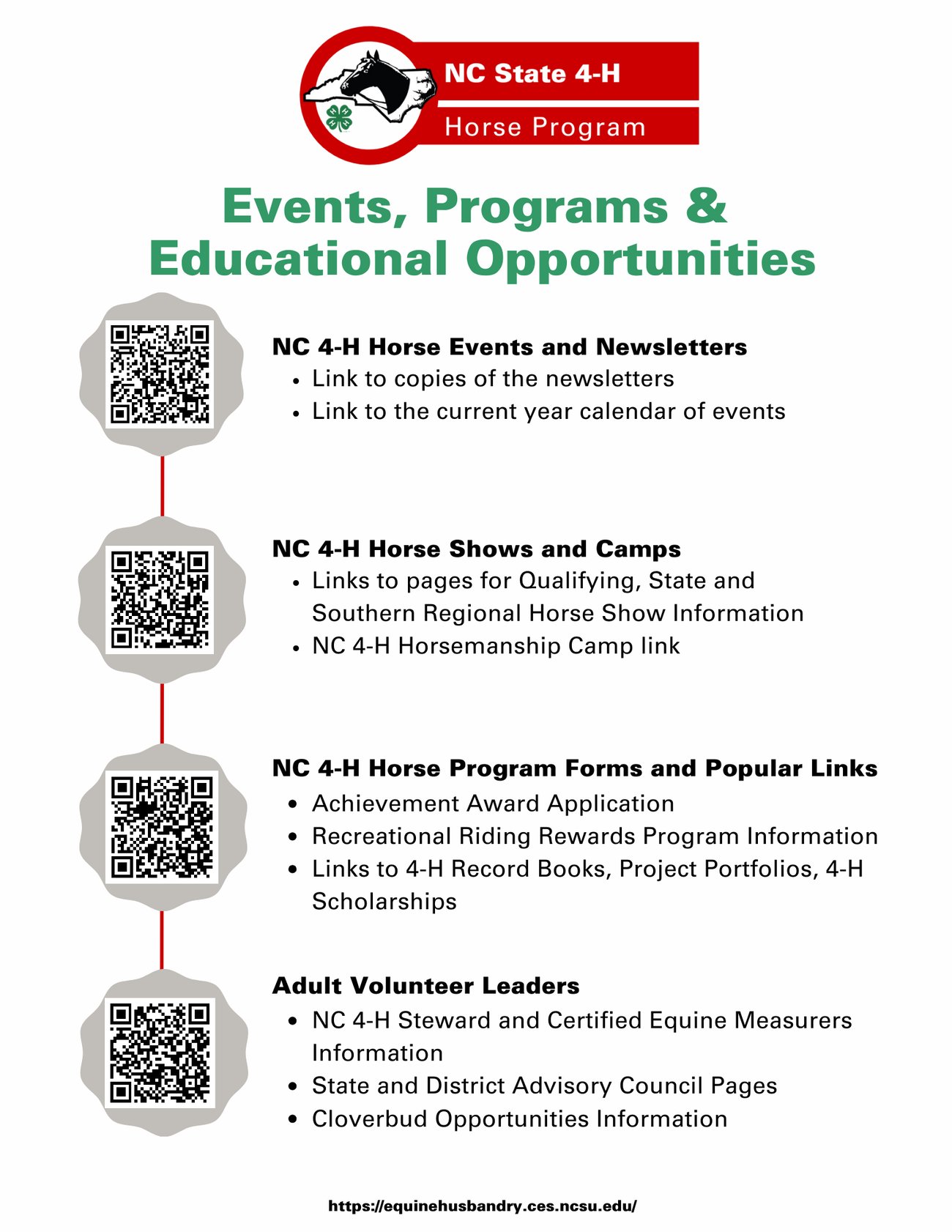 Are you new to the NC 4-H Horse Program or know someone interested in joining 4-H? Be sure to check out the handout linked below that outlines all the different events, programs, and educational opportunities that are available! |
