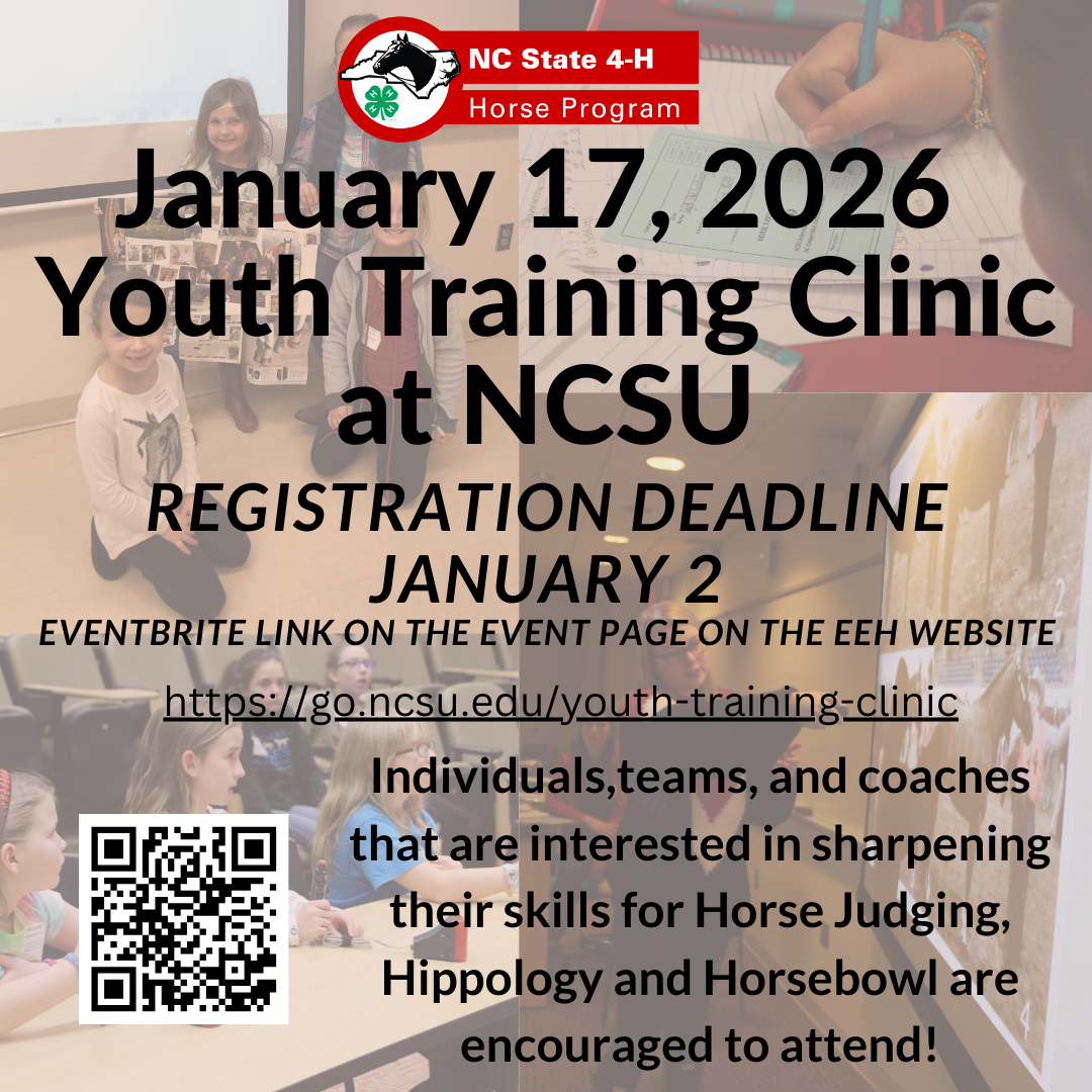 Registration is officially OPEN for the January 17, 2026, Youth Horse Judging, Hippology, and Horsebowl Training Clinic at NC State! Please note: Registration is limited by group (Cloverbud- 20, Rookie-80, Non-Rookie 100). Priority and preference will be given to NC 4-H and NC FFA members. If space remains after January 2, out-of-state participants will be accepted on a first-come-first-serve basis.