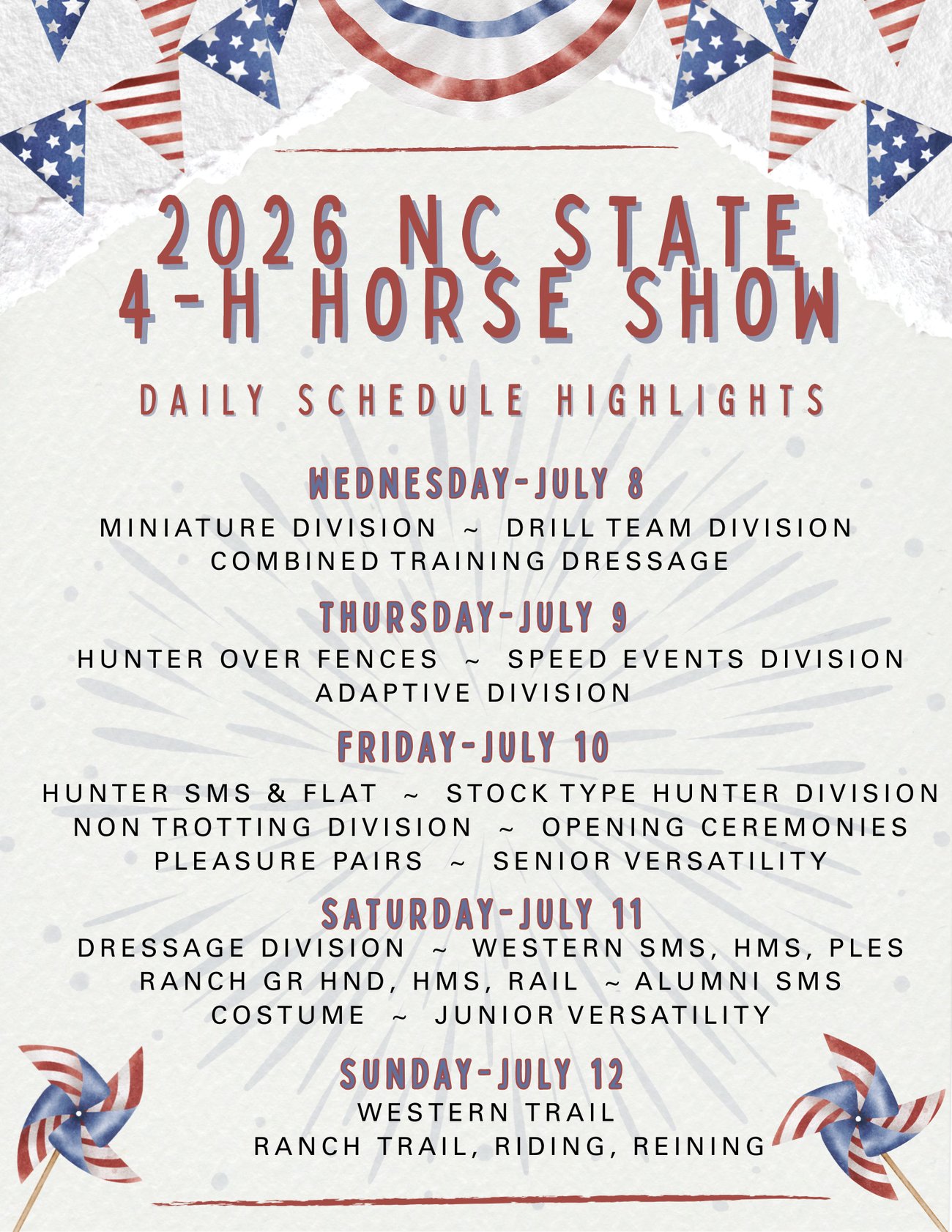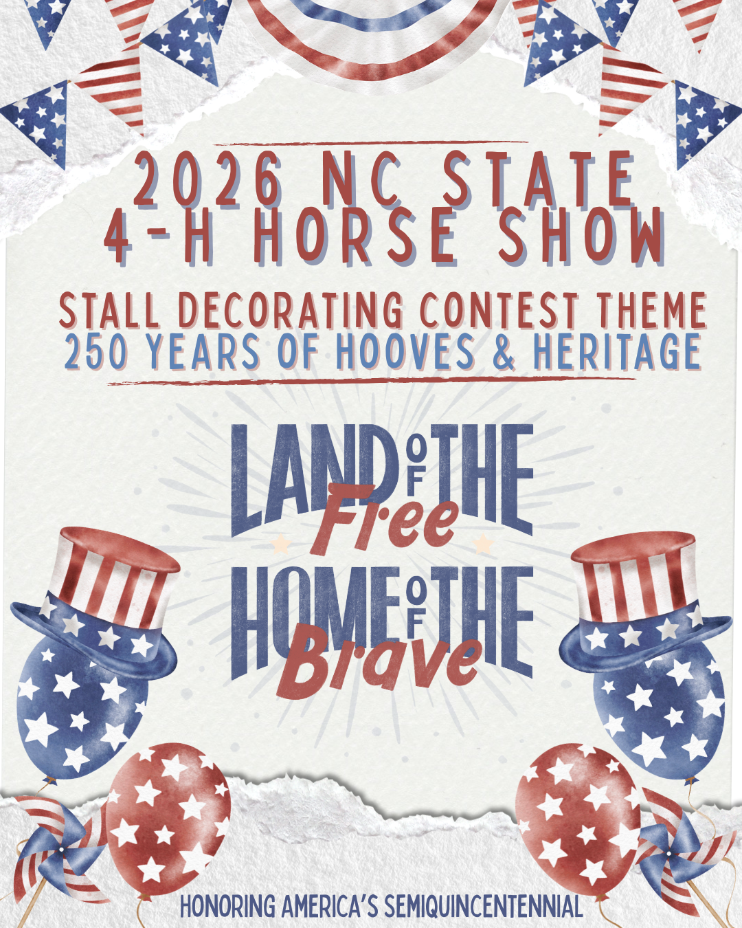 The 2026 NC State 4-H Horse Show Stall Decorating Contest is "250 Years of Hooves & Heritage," honoring America's Semiquincentennial (America 250). Start planning your creative, patriotic, and historically inspired stall decor!