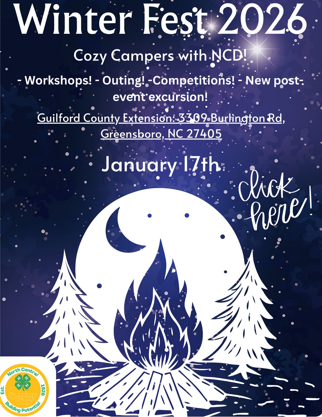 Join the North Central District 4-H Officers for a day of learning, leadership, and friendship at the Guilford County Extension office! This event begins at 9am and ends at 4pm. Lunch will be provided. WinterFest is open to youth ages 11-18 as of January 1, 2026