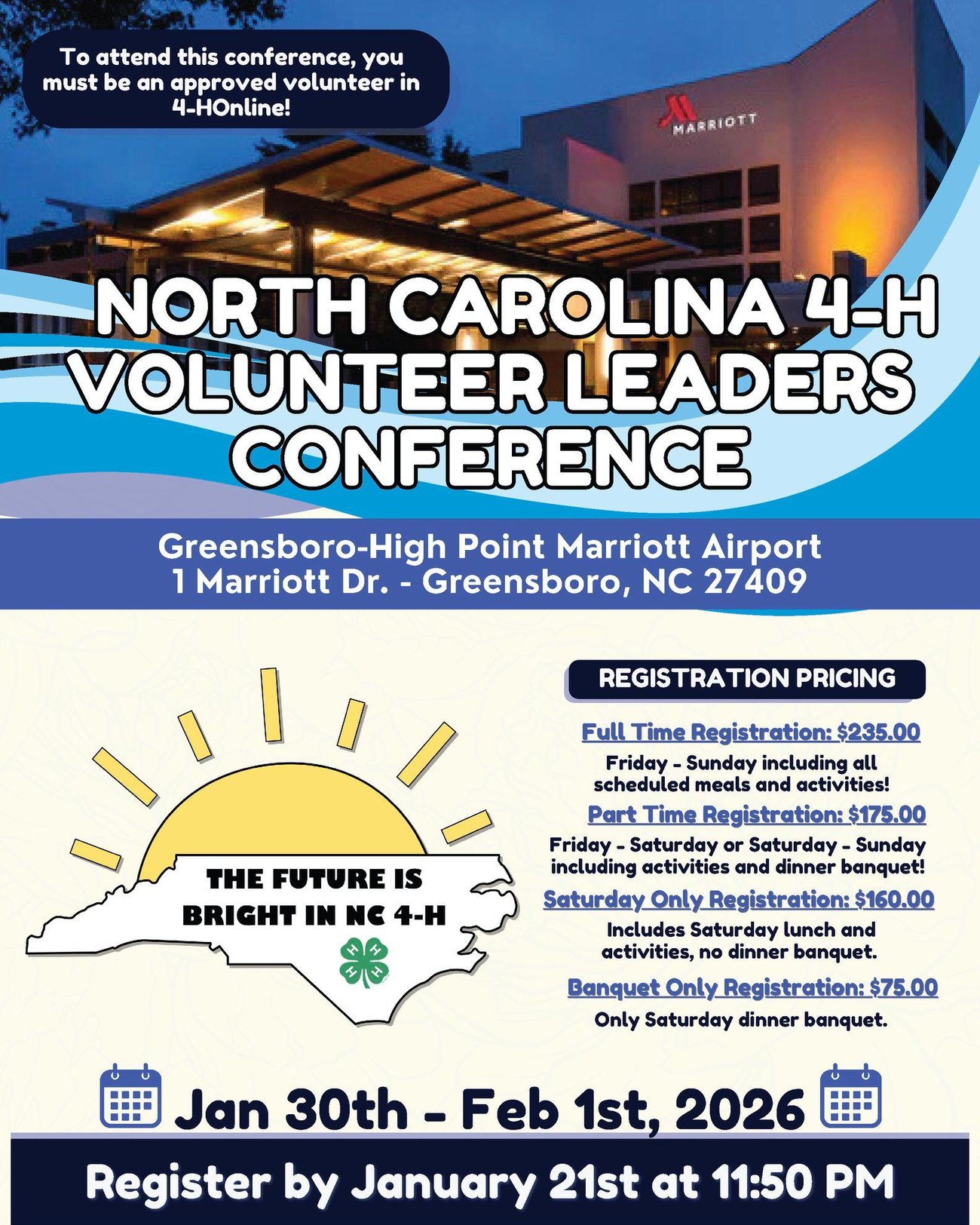 - Friday, January 30th - Sunday, February 1st - NC 4-H Volunteer Leaders Conference