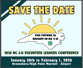 Registration information has been sent out via email for the 2026 NC 4-H Volunteer Leaders' Association Conference: January 30-February 1, 2026 at the Greensboro/High Point Marriott.
