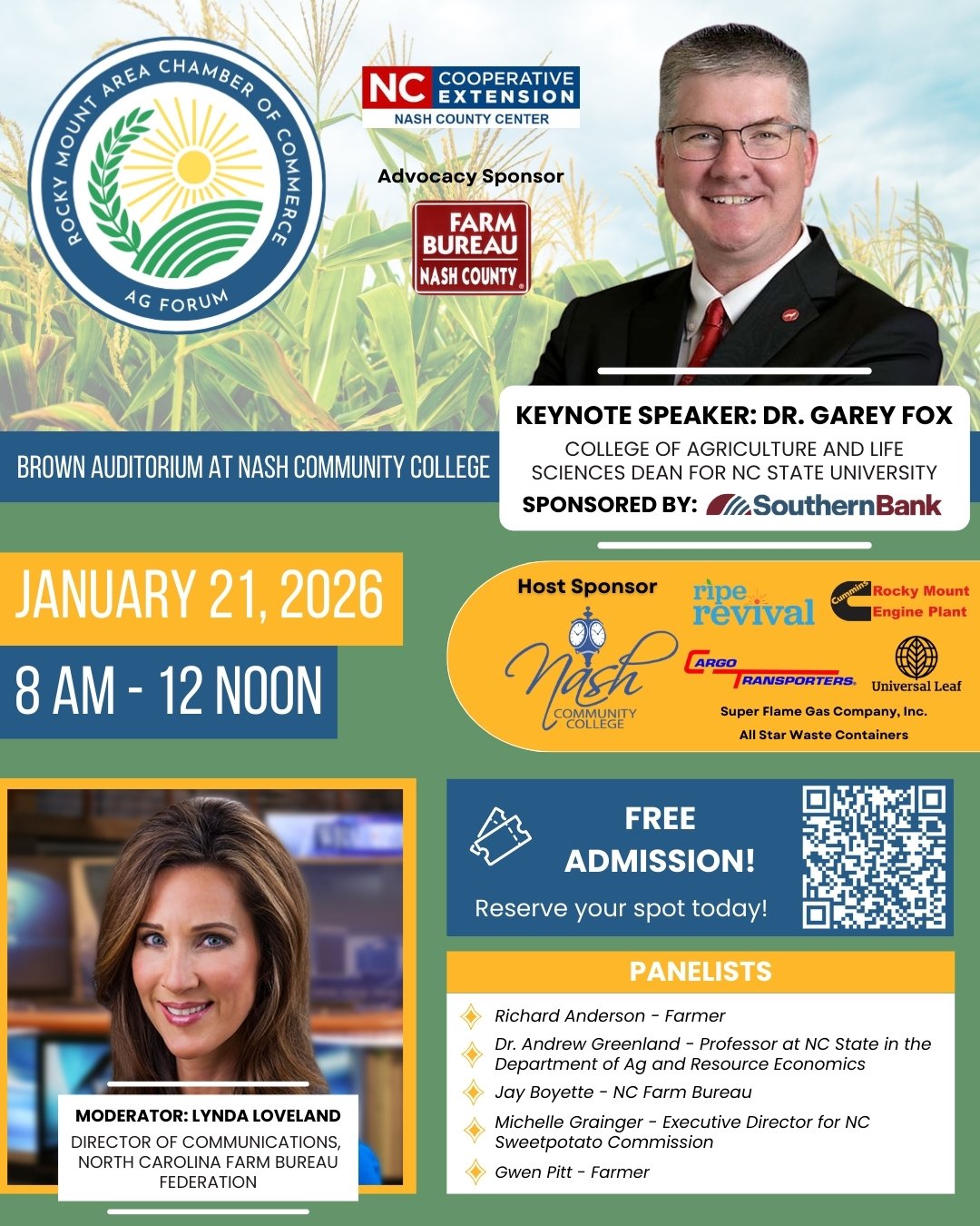 Join us on January 21st at Nash Community College's Brown Auditorium for the Rocky Mount Chamber of Commerce Ag Forum. The Agriculture Forum is a premier event bringing together industry leaders and farmers to discuss the latest trends, innovations, and challenges in agriculture. Attendees will gain valuable insights through keynote presentation, panel discussions, and networking sessions, all designed to foster collaboration and knowledge-sharing. Whether you're a seasoned professional or new to the industry, the Ag Forum is the place to connect, learn, and grow in the ever-evolving world of agriculture. The Keynote Speaker will be Dr. Garey Fox, NC State's Dean of the College of Agriculture and Life Sciences. A lively panel discussion about the effect of tariffs on agriculture will follow. Breakfast begins at 8:00.