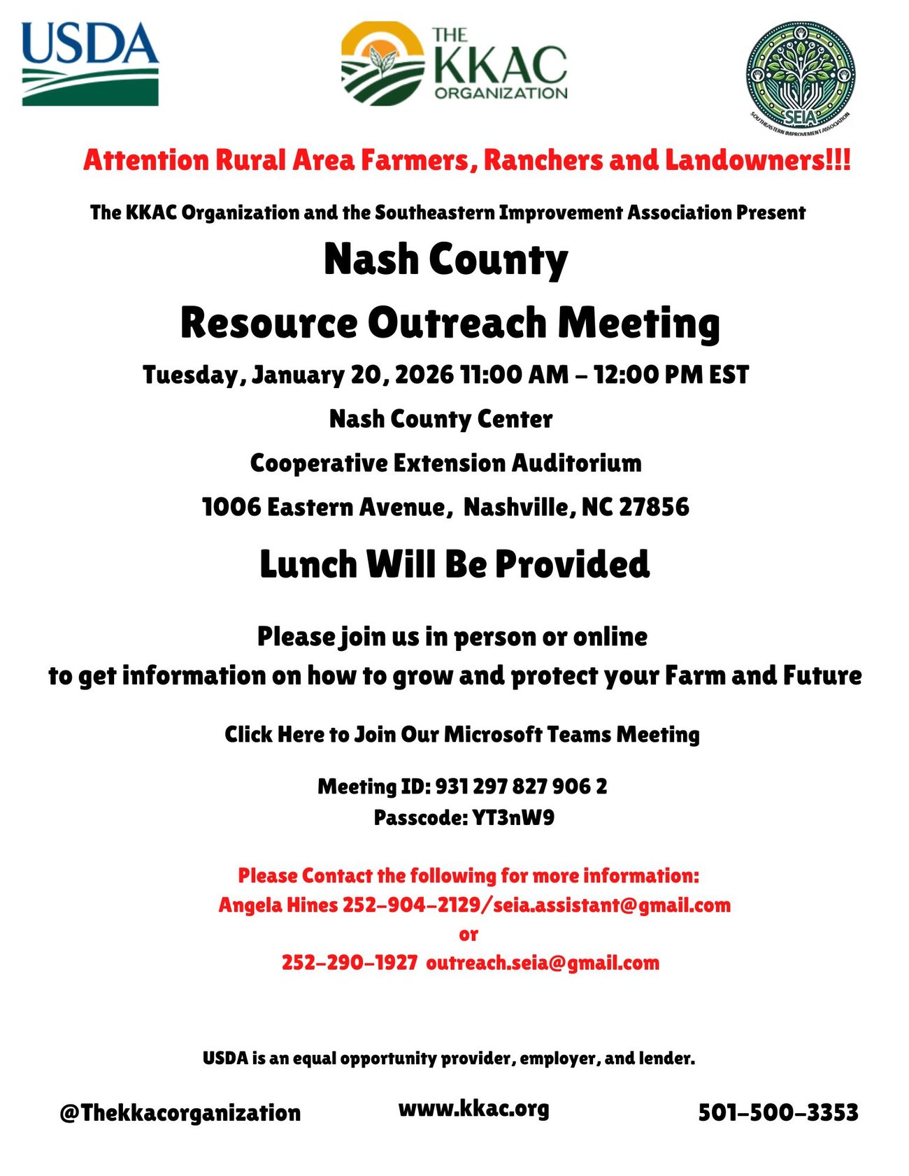 We would like for farmers, ranchers, and landowners from Nash and surrounding counties to join us for an upcoming Resource Outreach Meeting in Nash County on January 20th at 11:00 AM. You can also join online. This meeting will provide an opportunity to learn about the various programs and services offered through the USDA and the Natural Resources Conservation Service (NRCS). Our goal is to share valuable information and resources that support local producers, landowners, and community organizations in strengthening agricultural and conservation efforts. We hope you will join us and take advantage of this informative session.