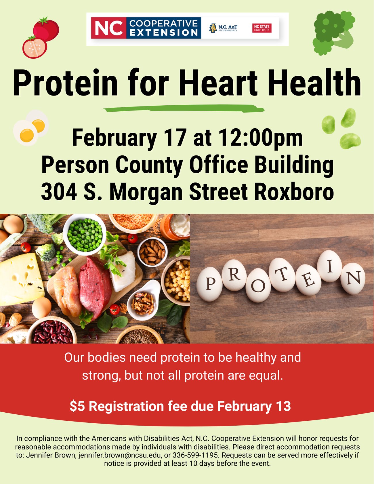 Our bodies need protein to be healthy and strong, but not all proteins are equal. Join us as we celebrate Heart Health Month while focusing on the proteins in our diet. We can eat protein and still be heart healthy. Come and learn how to make healthier protein choices. Our February Lunch N' Learn will be held on Tuesday, February 17 at 12:00pm the Person County Office Building, and includes a healthy, delicious lunch. Registration is $5 and is due by the Friday before. |
