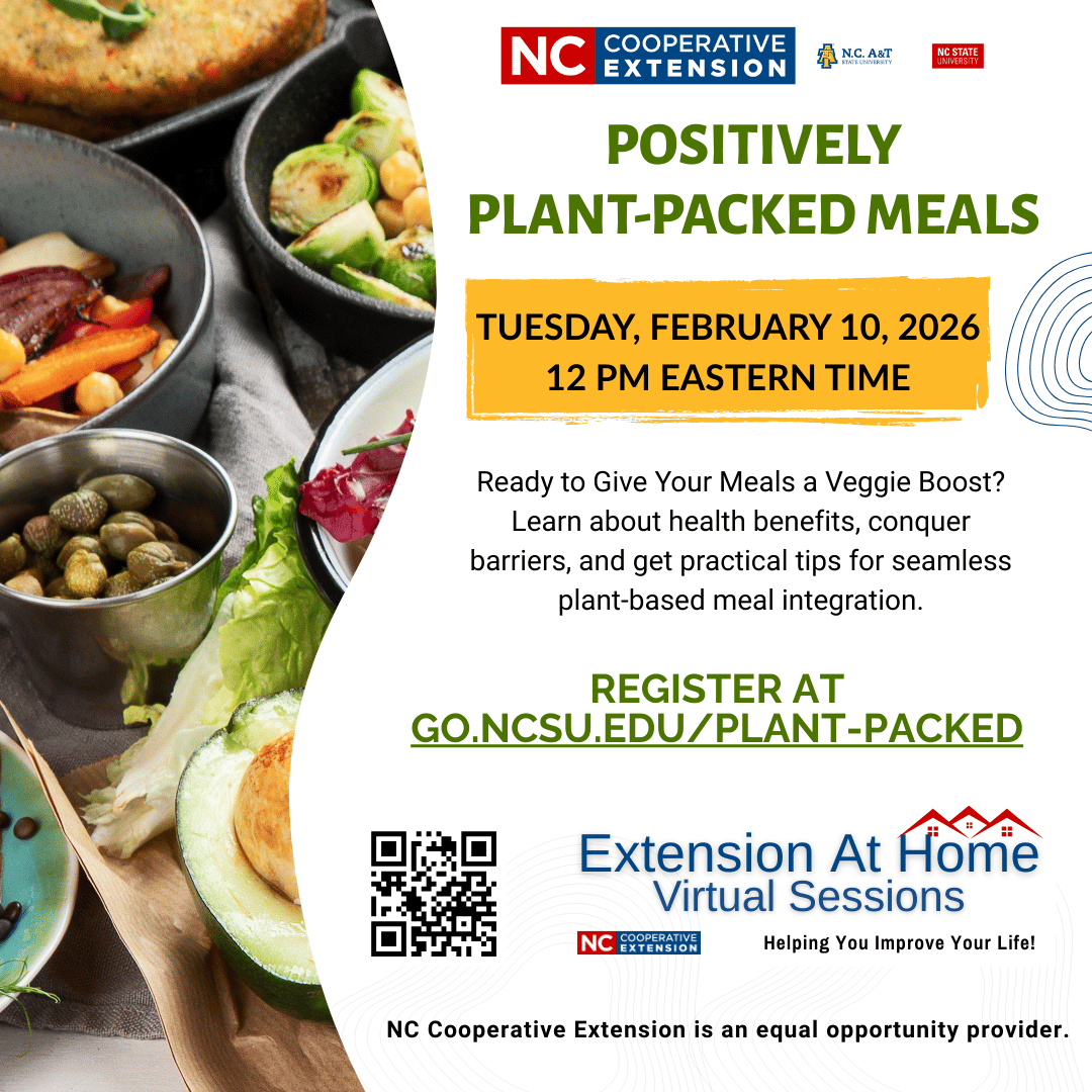 Ready to explore the powerful world of plant-based eating? Join us in demystifying what it means to eat plant-based, understanding the why moving toward a more plant-forward diet can be beneficial for your health, and learn how to navigate common barriers. Join the N.C. Cooperative Extension on Tuesday, February 10 at 12:00 p.m. (EST) for virtual workshop! Register online now at https://go.ncsu.edu/plant-packed |