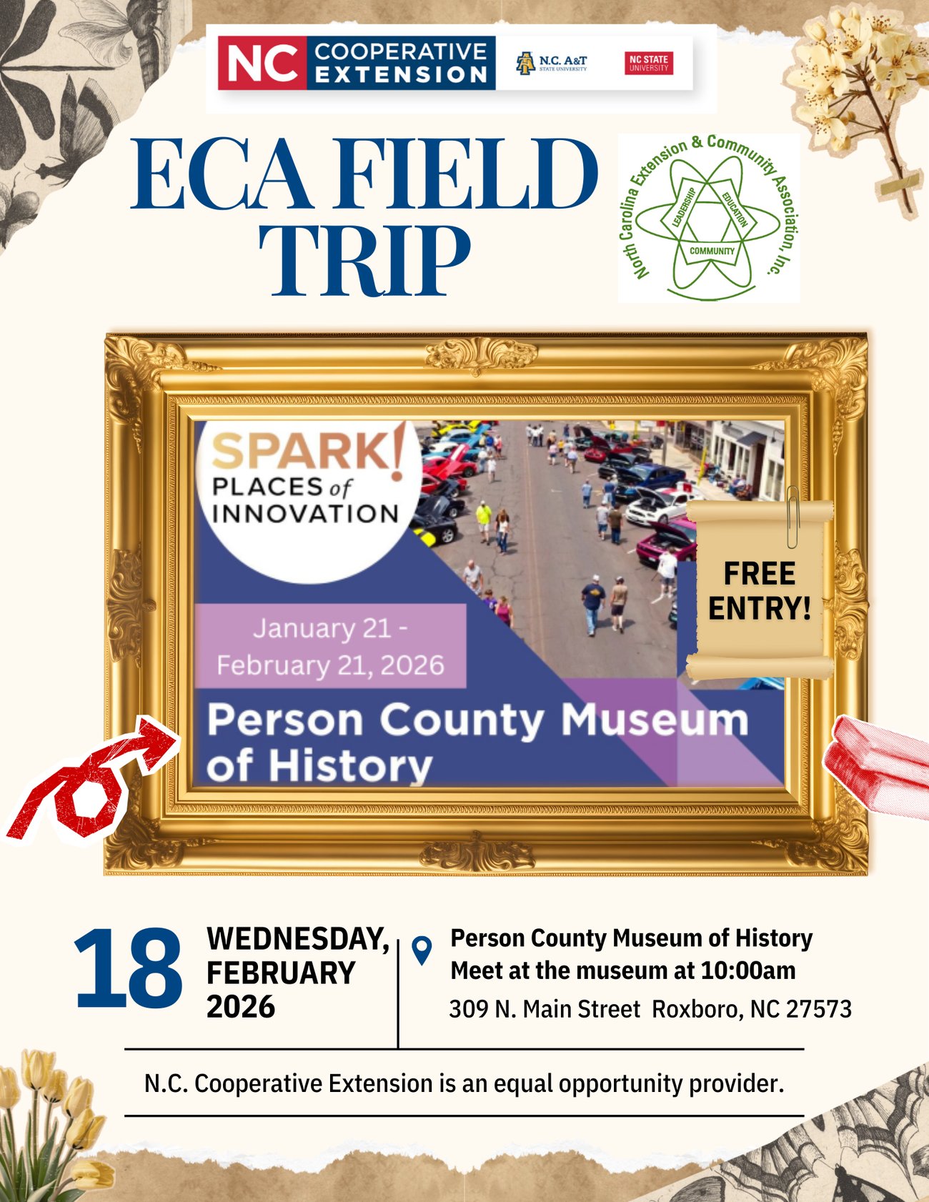 In collaboration with NC Humanities, the Person County Museum of History is thrilled to announce it will host the traveling exhibit Spark! Places of Innovation. In addition to the Smithsonian designed exhibit, PCMH will develop a companion exhibit “Igniting the Spark: Innovation and Invention in Person County. The Person County Extension Community Association (ECA) members will be going on a field trip to tour the exhibit on Wednesday, February 18 at 10:00 a.m. RSVP to Jennifer at the Extension Office at 336-599-1195. |