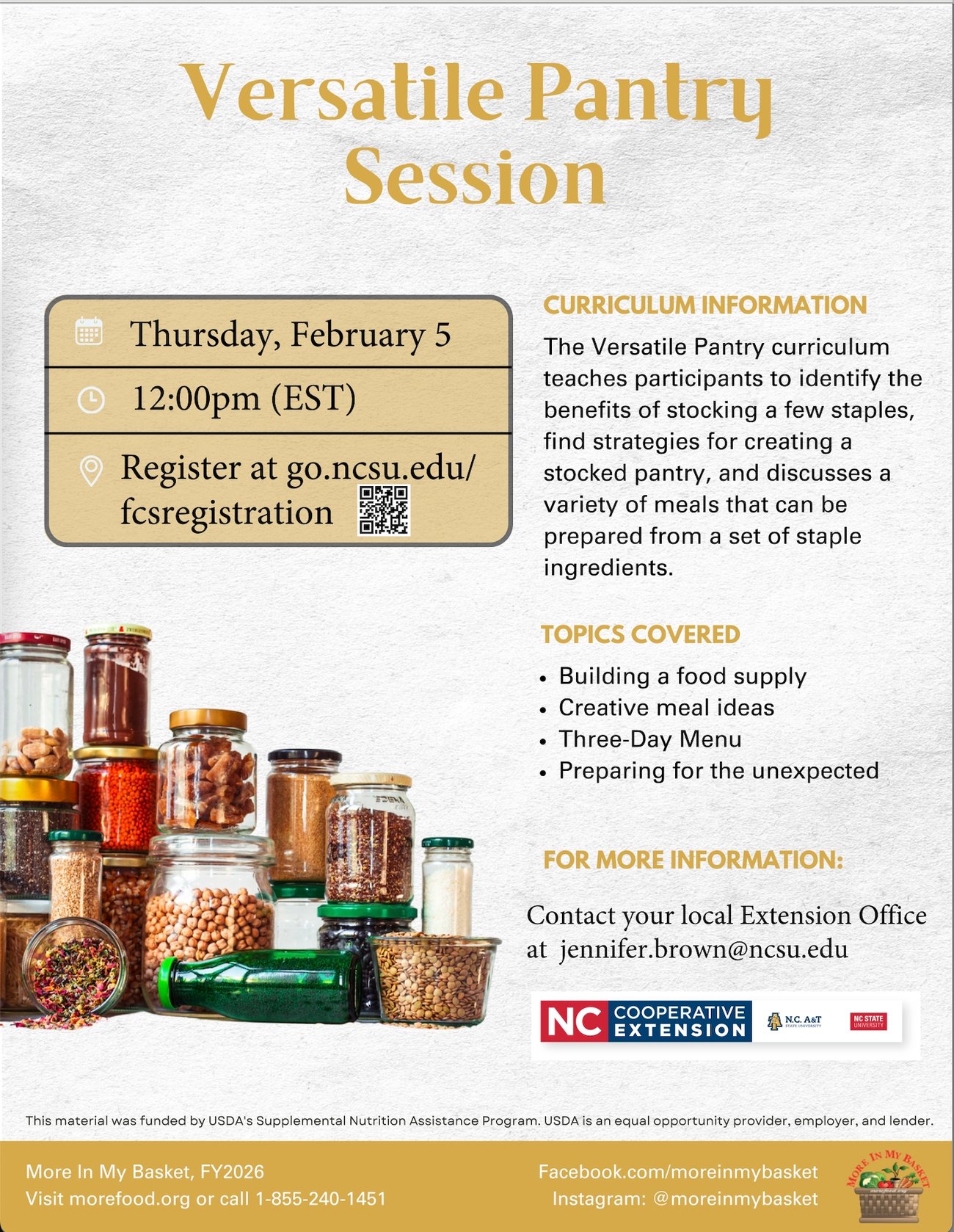 The Versatile Pantry curriculum teaches participants to identify the benefits of stocking a few staples, find strategies for creating a stocked pantry, and discusses a variety of meals that can be prepared from a set of staple ingredients. Topics covered include: building a food supply, creative meal ideas, three-Day menus, and preparing for the unexpected. Join us on Thursday, February 5 at 12:00 p.m. (EST) for this Zoom Workshop. Register online at go.ncsu.edu/fcsregistration |
