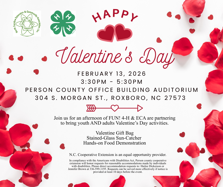 4-H and the Extension Community Association (ECA) members are joining forces for a Valentine’s Fun Day!! We will be doing a community service project, fun crafts and hosting a live food demonstration!! Join us Friday, February 13 at 3:30 p.m. – 5:30 p.m. at the Person County Extension Office. RSVP by calling 336-599-1195. |
