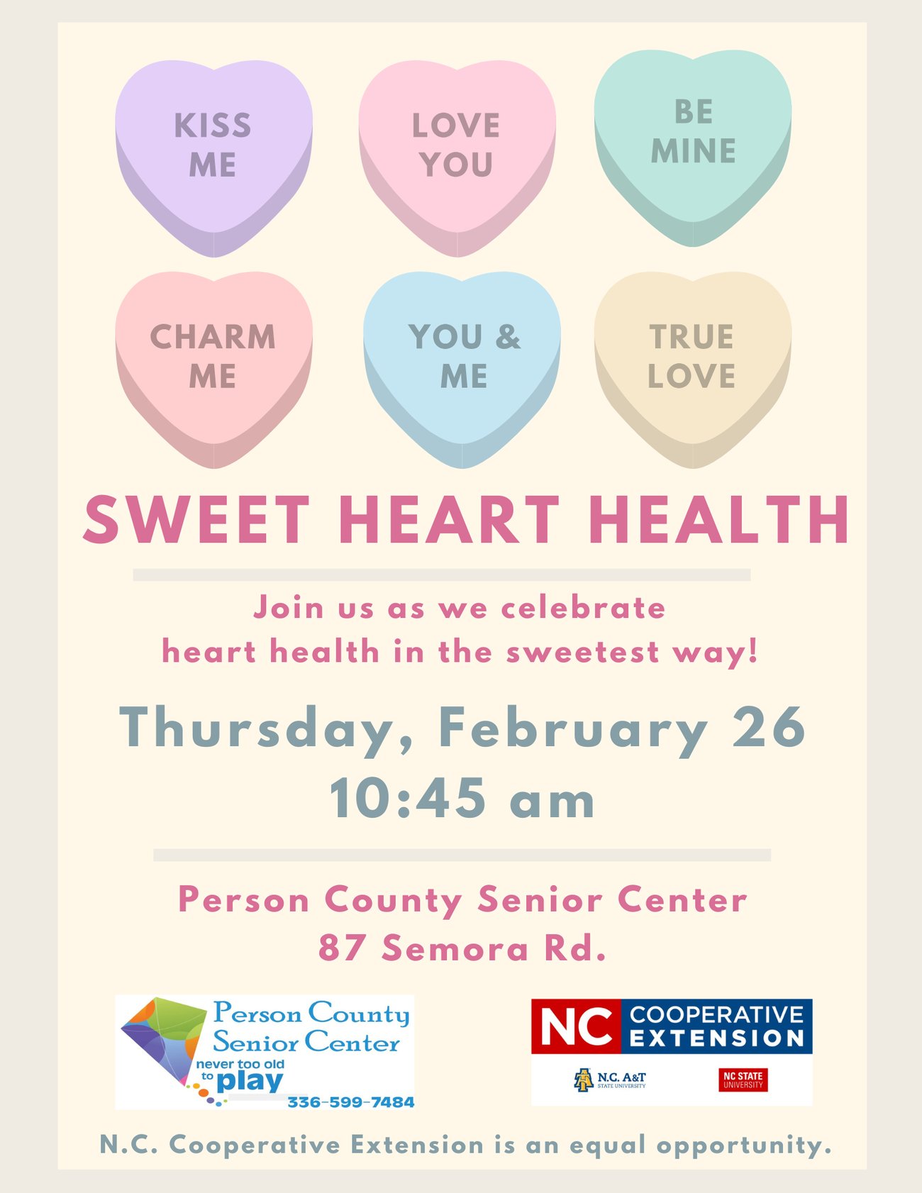 Join us for a delicious morning celebrating American Heart Month, exploring the surprising health benefits of dark chocolate and how it can fit into a heart-healthy lifestyle. Who know taking care of your heart could taste so good? This “Sweet Heart Health” workshop focusing on chocolate and wellness will be held on Thursday, February 26 at 10:45 a.m. at the Person County Senior Center. Learn about flavonoids how they help lower blood pressure, receive tips on portion control, and reading nutrition labels.