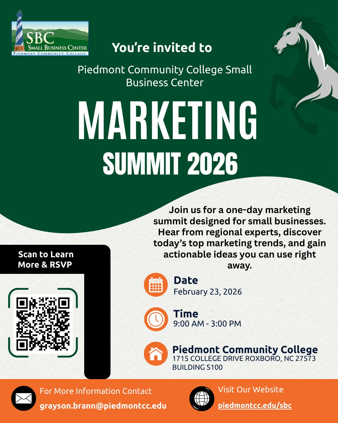 Join the Piedmont Community College Small Business Center Marketing Summit for a one-day event on Monday, February 23 from 9:00am - 3:00pm, focused on smart, practical marketing strategies for small businesses. Learn from regional experts and community leaders, explore current trends, and walk away with ideas you can put to work right away. Connect, learn, and grow right here in our community. For more info or to register, visit their website at piedmontcc.edu/sbc |