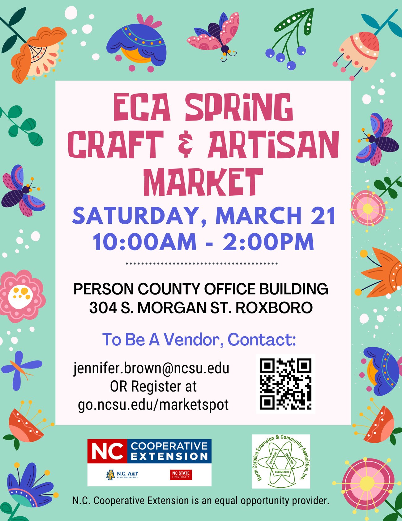 We're now accepting vendors for the ECA Spring Artisan & Craft Market, scheduled for Saturday, March 21 from 10:00am - 2:00pm. Whether you sell unique products, delicious food, or offer exciting services, we want to bring your business to a whole new audience!! A vendor spot costs $40 and you get one (6-8ft) vendor table and two chairs are provided. Electrical access can be provided to some upon request. Register online at go.ncsu.edu/marketspot |
