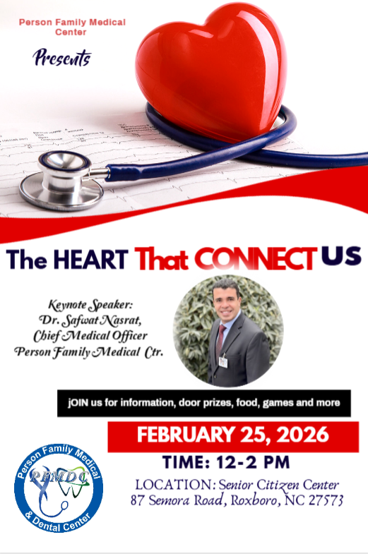 The Person Family Medical Center will be collaborating with Person County Senior Center hosting a National Heart Health event on Wednesday, February 25 from 12:00pm to 2:00pm. Dr. Nasrat, Medical Director at PFMC will speaking about heart health and free blood pressure checks will be offered. There will also be door prizes, food, games, and a variety of other vendor booth organizations on site providing information and resources. It is free to attend so be sure to stop by. |