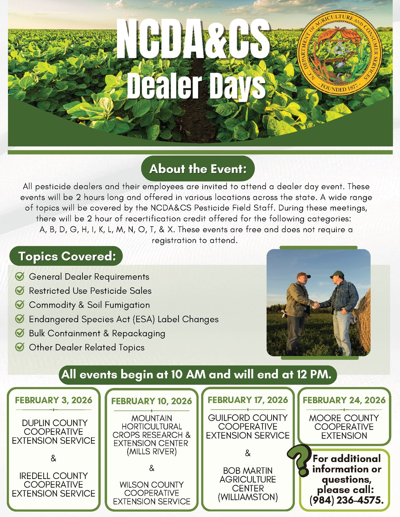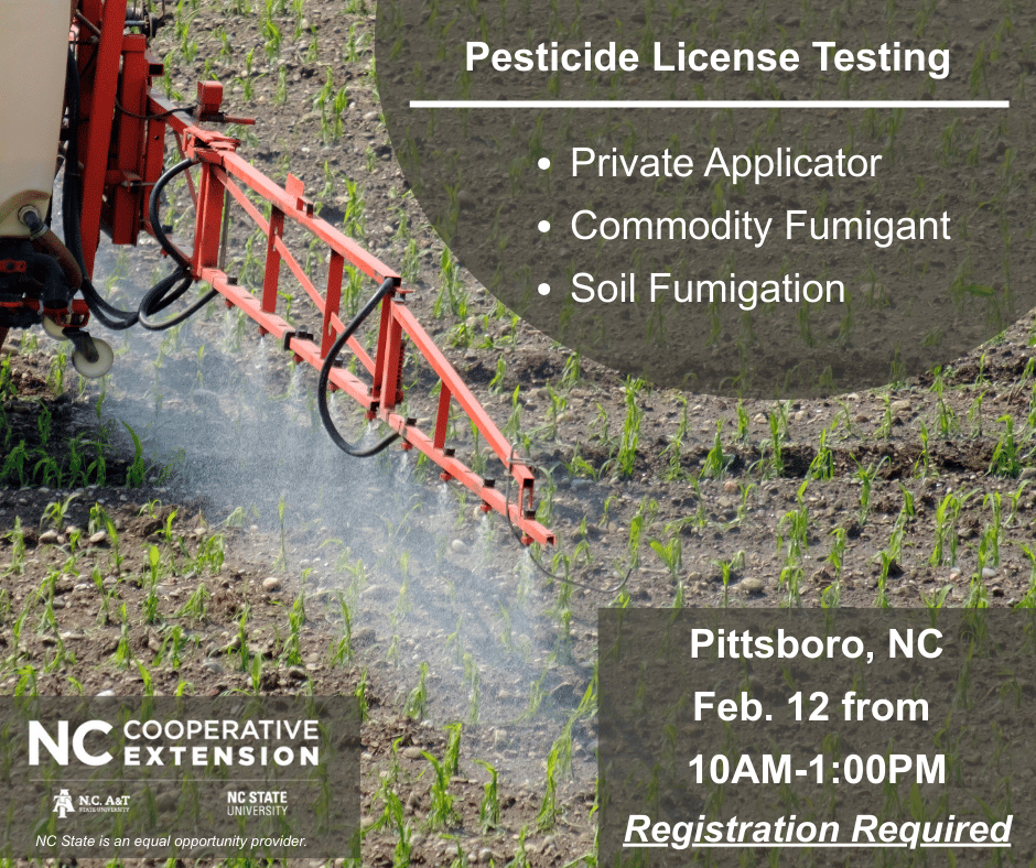 Join us on February 12, 2026, at 10:00 a.m. at 1192 U.S. Hwy 64 West Business for agricultural pesticide exam testing administered by the NC Department of Agriculture & Consumer Services. Farmers may take the Private Applicator exam first, and after it is submitted, may take either the Soil Fumigation or Commodity Fumigation exam if time permits. Testing fees will be collected by NCDA&CS at the time of testing.