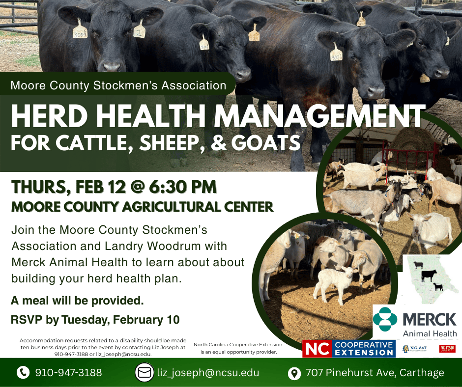 The Moore County Stockmen's Association will have Landry Woodrum with Merck Animal Health at their meeting on February 12. He will be talking about herd health and vaccines for cattle, sheep, and goats. |