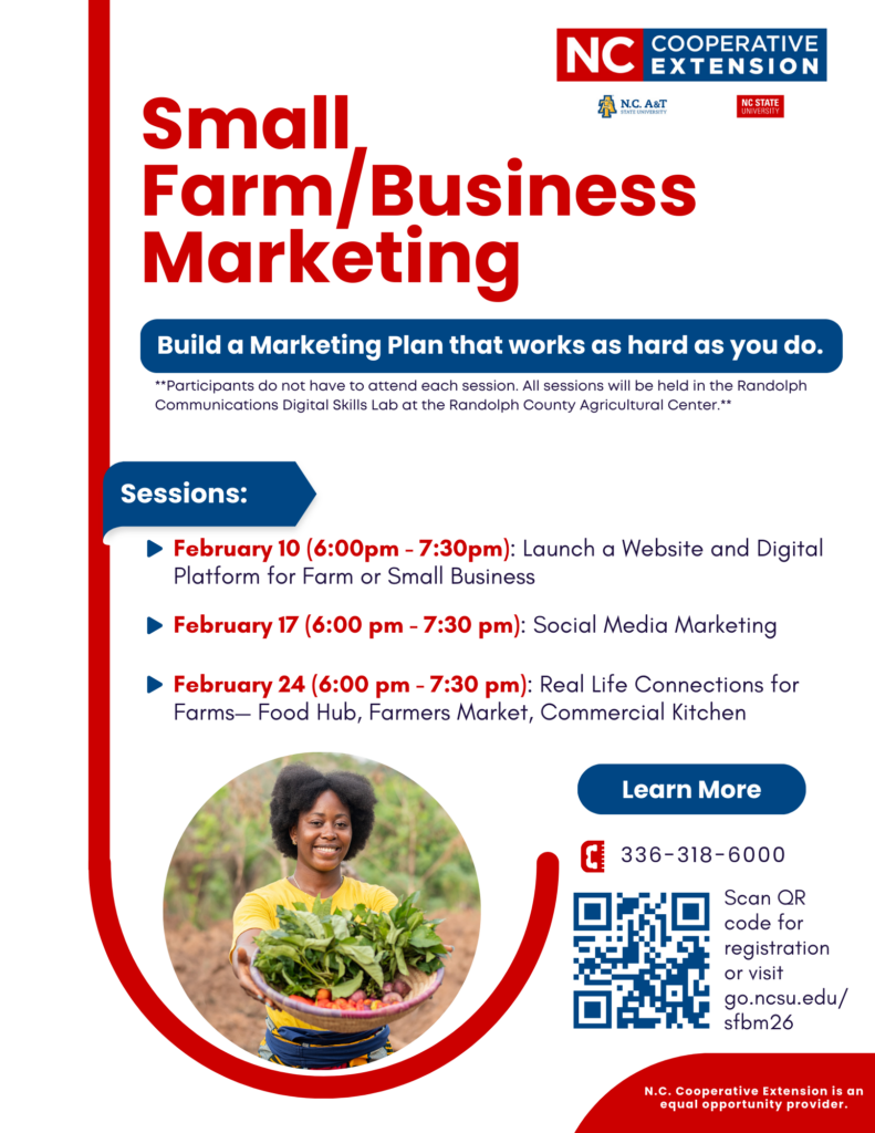 Do you need to raise online visibility for your farm or small business? Sign up to attend any or all of this three-part series. You will learn how to build a 2026 website, optimize your Google Business Profile, reach more customers through social media, and grow real sales using tools like the Randolph County Food Hub.