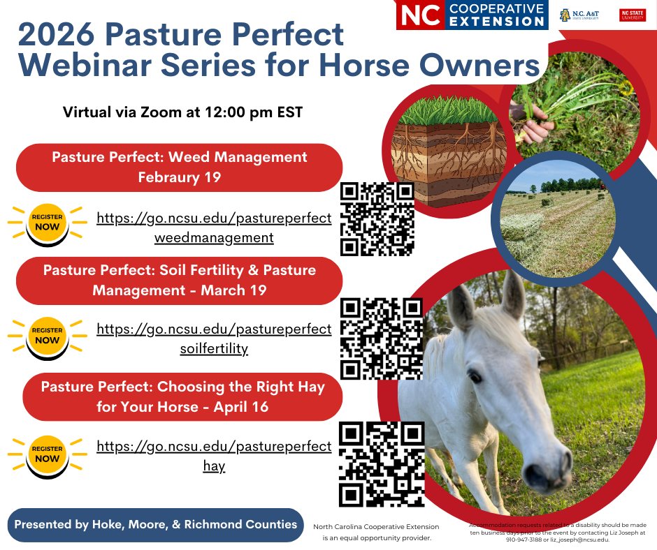 In the Pasture Perfect webinar series, Extension Agents in Hoke, Moore, and Richmond counties will provide practical, research-based information to help you improve pasture health, reduce weed pressure, and make better hay purchasing decisions. Perfect for new and experienced horse owners alike. These virtual discussions will begin at 12:00 PM EST and will conclude around 1:00 PM EST.