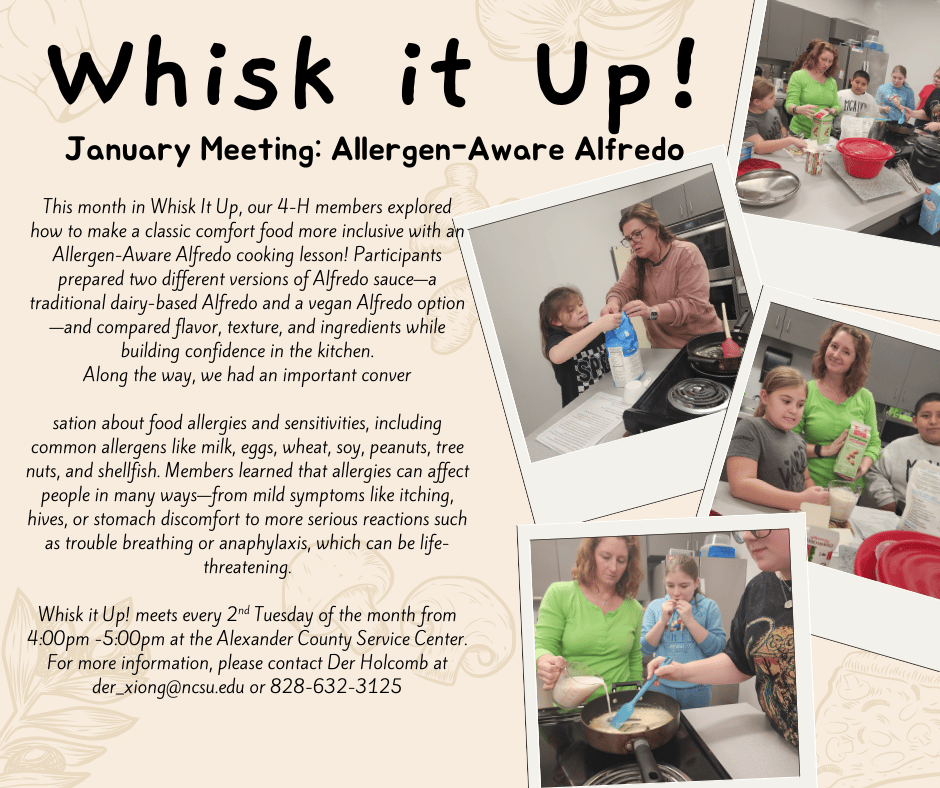 Whisk it Up 4-H Cooking Clubmeets 2nd Tuesday of each month at 4:00 p.m. Location: Alexander County Service Center.