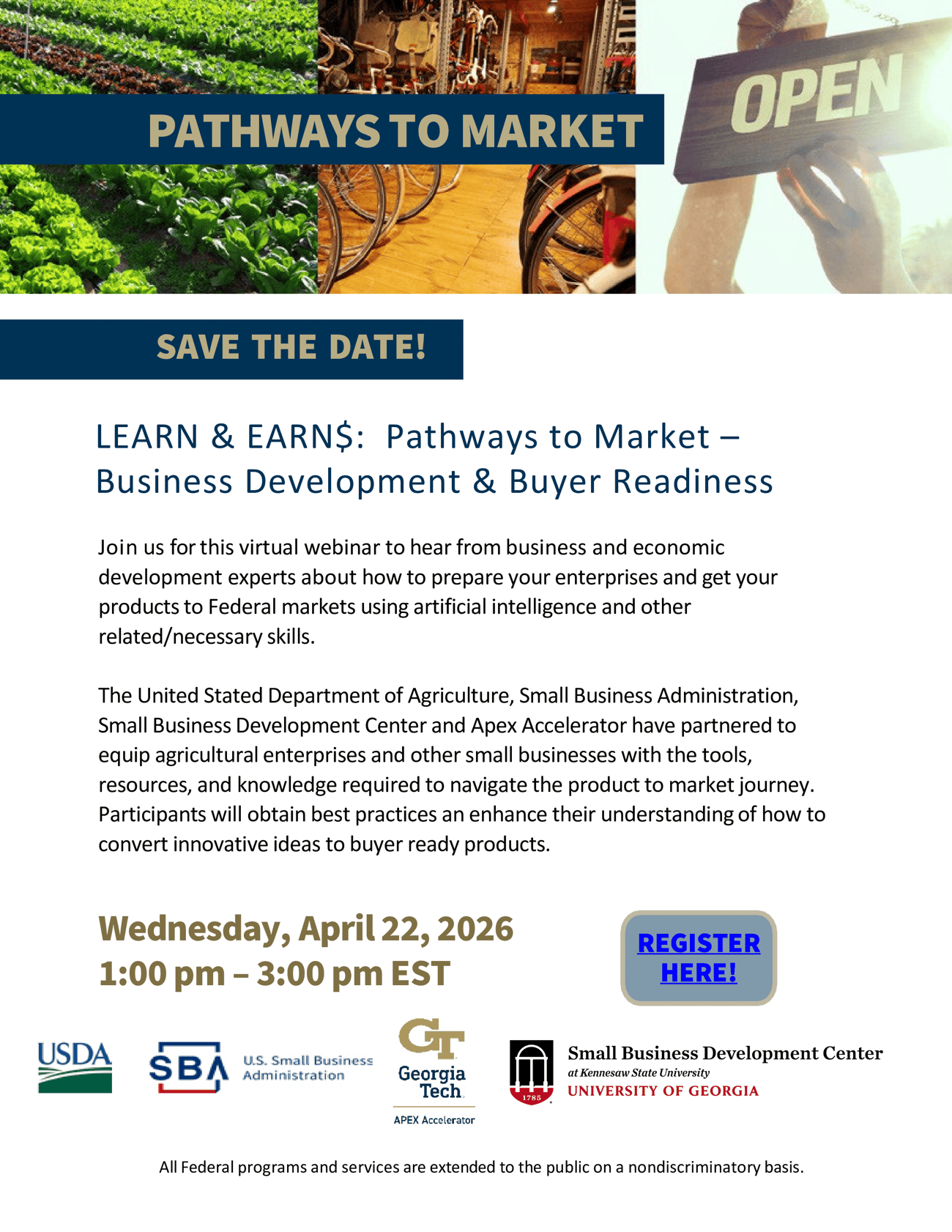 The United States Department of Agriculture, Small Business Administration, Small Business Development Center, and Apex Accelerator have partnered to equip agricultural enterprises and other small businesses with the tools, resources, and knowledge