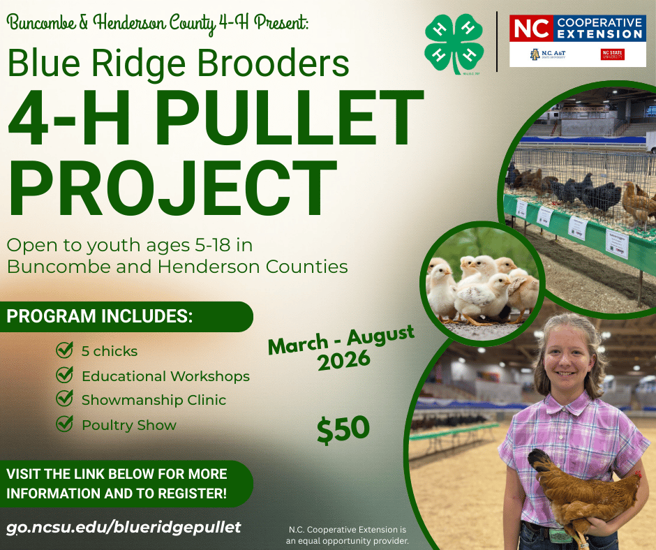 This program is designed for youth ages 5-18 in Buncombe and Henderson counties who are interested in raising and showing chicks. This project gives youth the opportunity to: