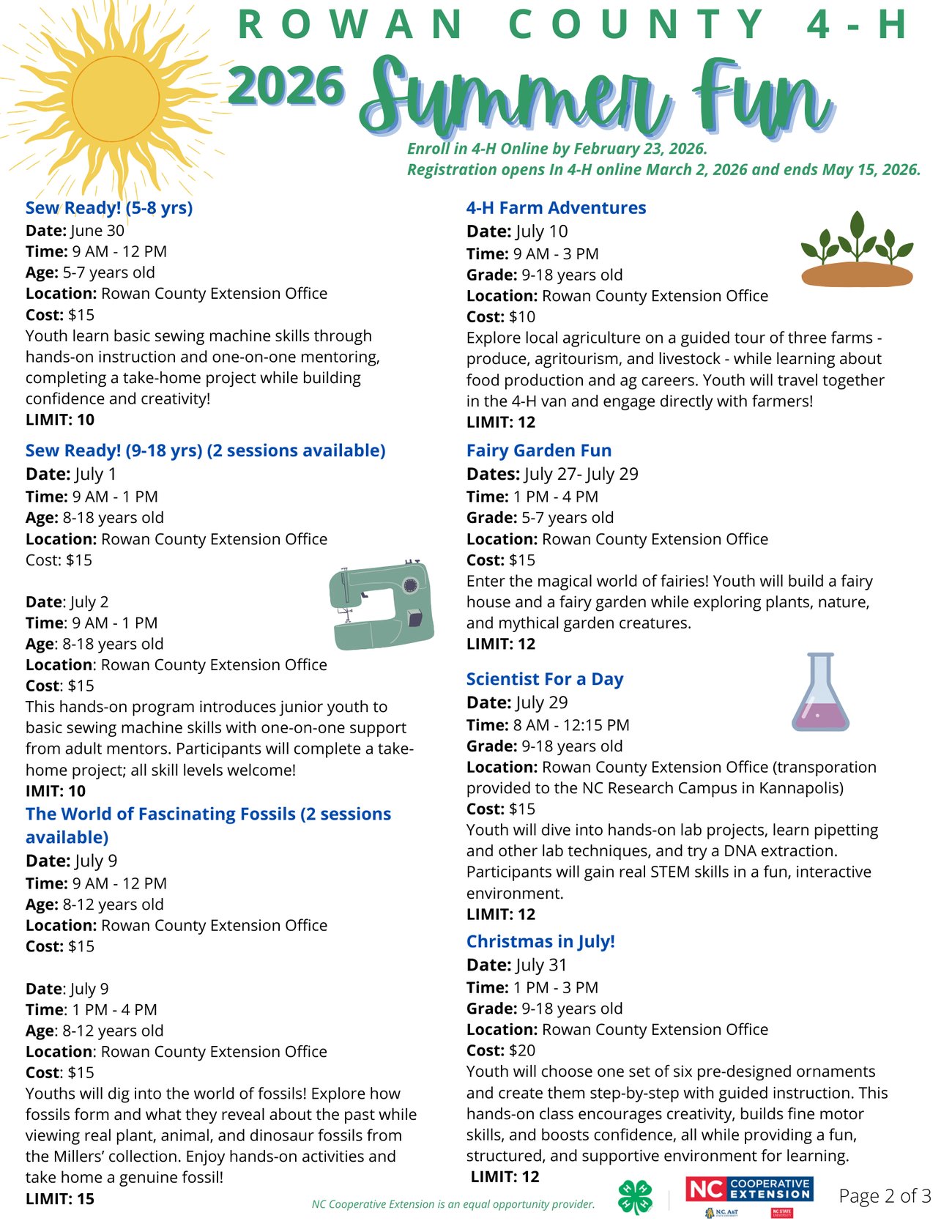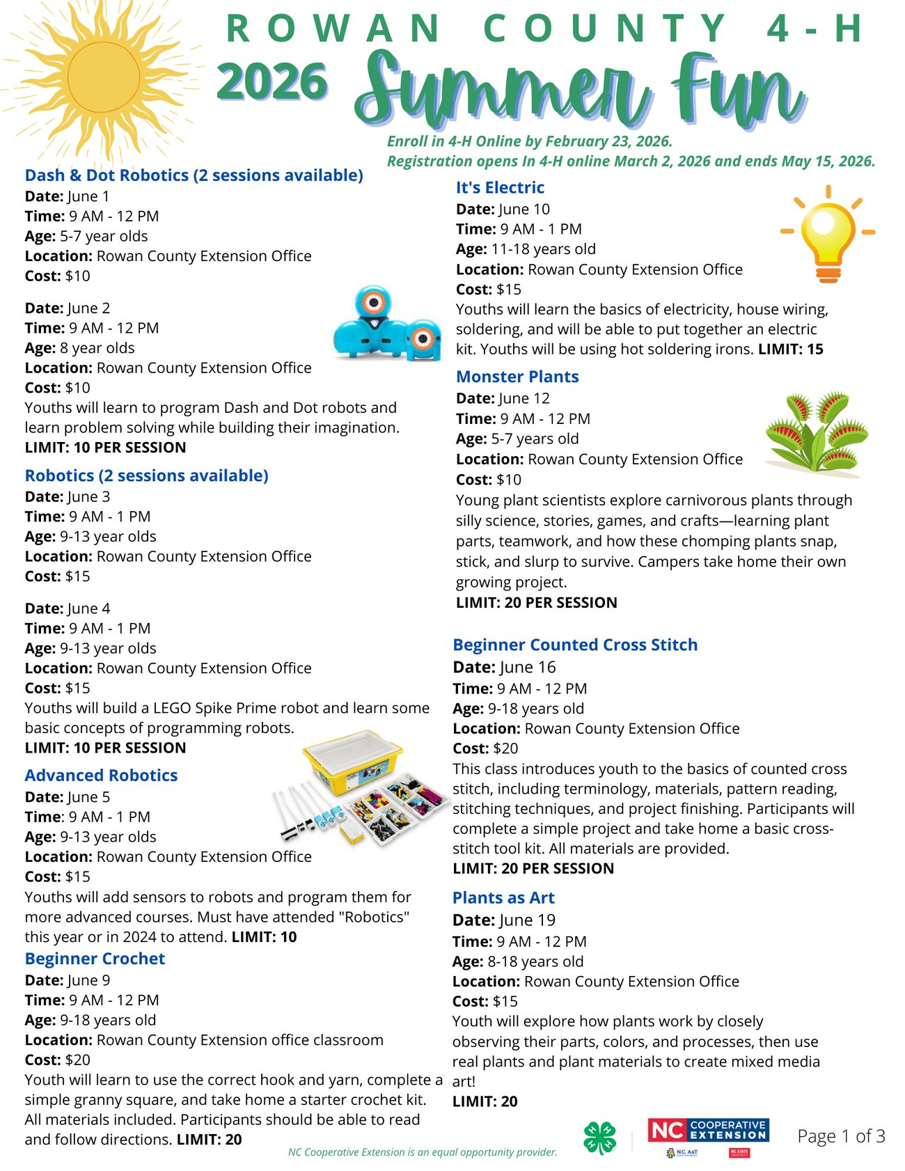 Registration opened on March 2. CLICK HERE to closely read ALL INSTRUCTIONS about how to enroll as a 4-H member in 4-HOnline (if you haven't yet for 2026) and how to register for 4-H Summer Fun via 4-HOnline "events"!