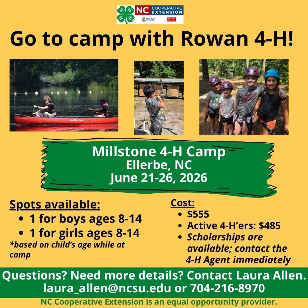 Rowan County 4-H is heading to Millstone 4-H Camp this summer on June 21-26, and we want your child to be part of the adventure! Scholarships are available!
