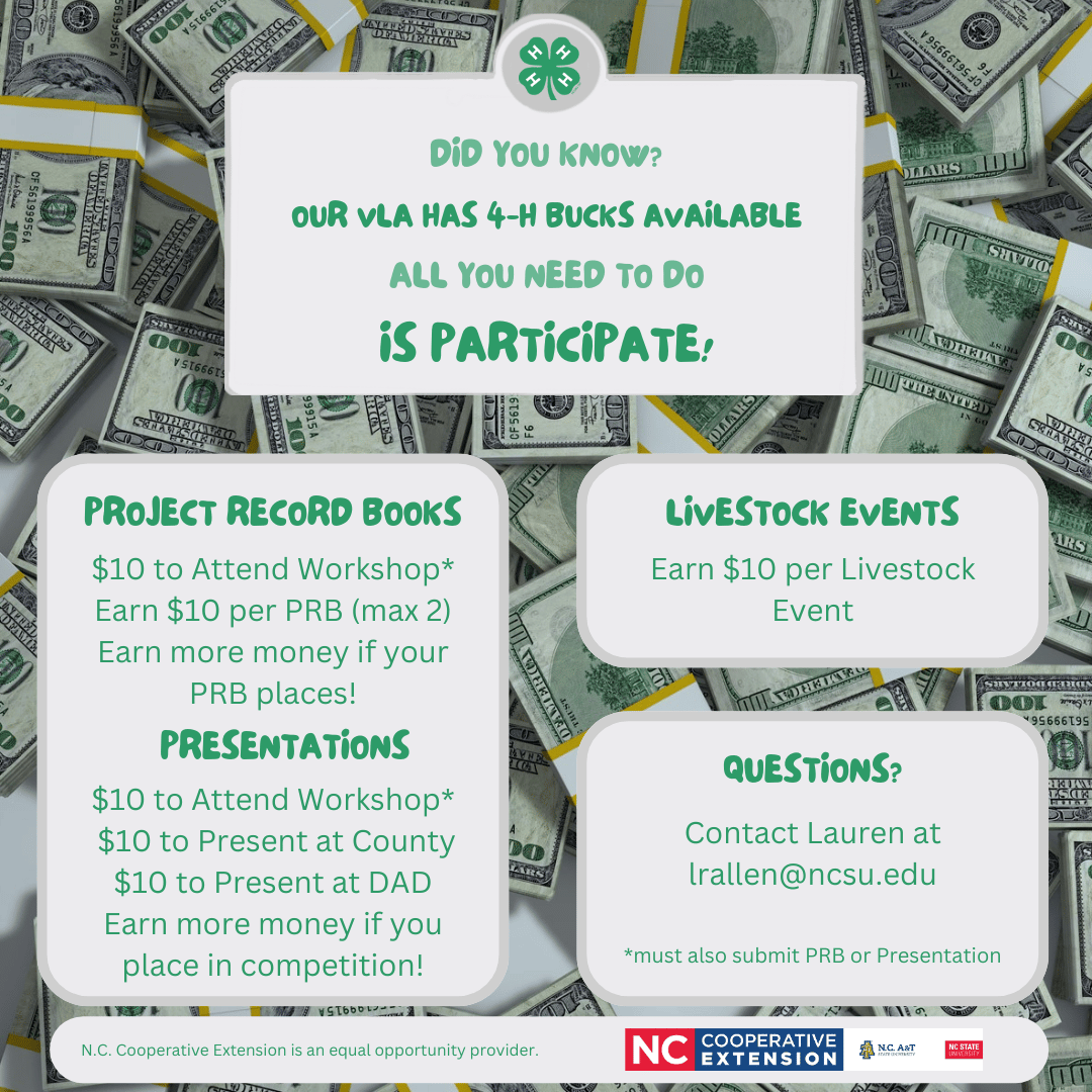 Our 4-H VLA has 4-H Bucks available? All you have to do to earn them is participate! For questions or details on how this program works, contact Lauren in the 4-H Office.