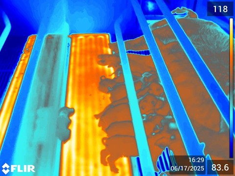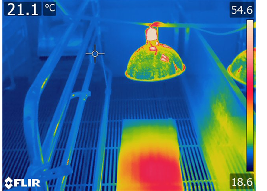 Existen varios tipos de fuentes de calor para microclimas disponibles comercialmente siendo los más comunes las lámparas de calor, tapetes térmicos, cobertores o encierros. Los encierros maximizan la retención de calor en el área de microclima, pero pueden dificultar la inspección visual de los lechones y la limpieza de esta área. Las lámparas de calor son la opción tradicional para microclimas, pero pueden calentar inadvertidamente a la cerda si se colocan demasiado altas o cerca a la cerda en áreas de resguardo estrechas. Además, las bombillas generan un área calentada de forma variable, siendo las zonas directamente debajo de la lámpara las más calientes (Figura 1). Como alternativa, los tapetes térmicos pueden proporcionar un área calentada de manera más uniforme y requieren aproximadamente 36% menos consumo de electricidad (Figura 2; Stinn & Xin, 2014).