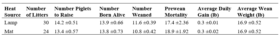 Table 1. Productivity metrics compared litters provided heat lamps vs. heat mats. No statistical differences were found. Values represent average ± standard error. |