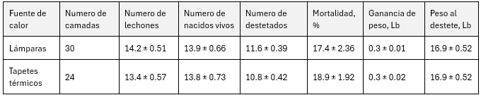Tabla 1. Métricas de productividad comparando camadas provistas con lámparas de calor vs. tapetes térmicos. Los valores representan el promedio ± error estándar.