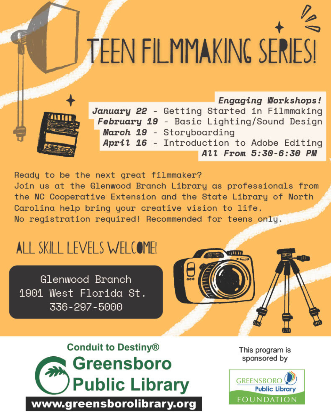 Calling all creative teens! Dive into the exciting world of filmmaking during this workshop series! Learn how to use cameras, record audio, and edit videos using professional software. This spring, the Glenwood Branch is offering a series of hands-on workshops, from storyboarding and shooting to editing your final project. Learn from a professional in this field and bring your questions. Unleash your creativity, collaborate with your friends, and bring your stories to life on screen! Meetings will take place on Thursdays (5:30 - 6:30 pm). No registration is required.