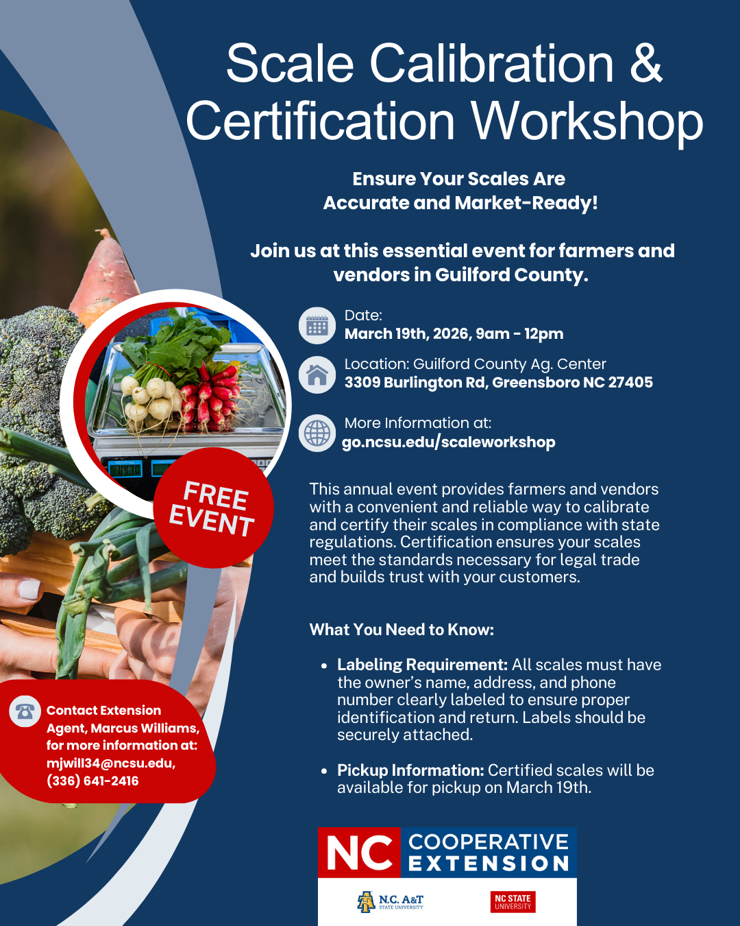 Get your scales calibrated and certified for legal trade at this annual event! Join us at this essential event for farmers and vendors in Guilford County on March 5th from 9 a.m.-12 p.m. The workshop will be at the N.C. Cooperative Extension Office at 3309 Burlington Rd, Greensboro NC 27405.