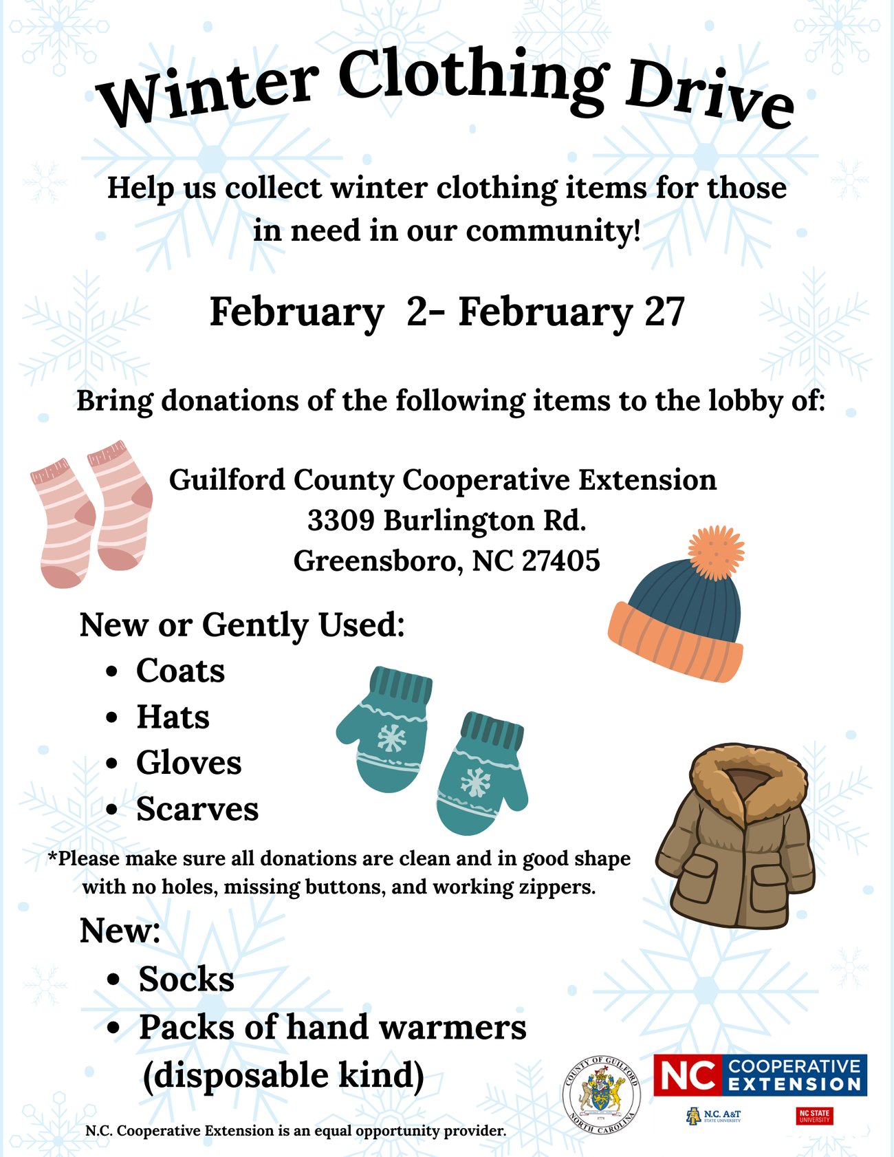 The NC Cooperative Extension - Guilford County Center is hosting a winter clothing drive throughout the month of February! We are collecting new or gently used coats, hats, gloves, and scarves, as well as new socks and disposable hand warmers. Donations can be placed in the collection box in the lobby under the AED (address: 3309 Burlington Rd., Greensboro, NC 27405). Β